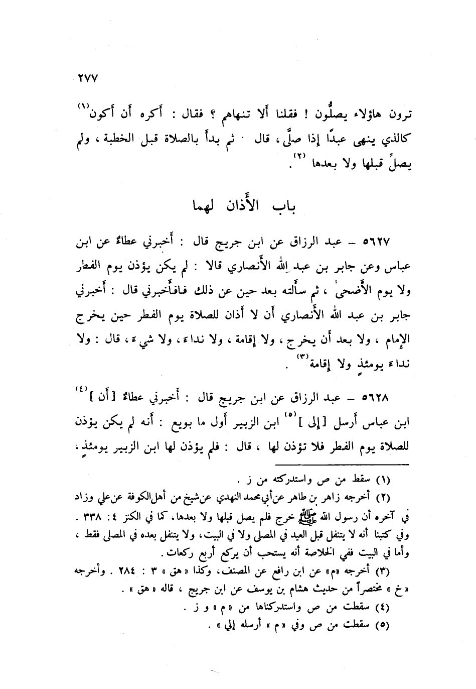 5627 - عَنِ ابْنِ جُرَيْجٍ قَالَ: أَخْبَرَنِي عَطَاءٌ، عَنِ ابْنِ عَبَّاسٍ، وَعَنْ جَابِرِ بْنِ عَبْدِ اللَّهِ الْأَنْصَارِيِّ، قَالَا: «لَمْ يَكُنْ يُؤَذَّنُ يَوْمَ الْفِطْرِ وَلَا يَوْمَ الْأَضْحَى» ثُمَّ سَأَلْتُهُ بَعْدَ حِينٍ عَنْ ذَلِكَ فَأَخْبَرَنِي قَالَ: أَخْبَرَنِي جَابِرُ بْنُ عَبْدِ اللَّهِ الْأَنْصَارِيِّ «أَنْ §لَا أَذَانَ لِلصَّلَاةِ يَوْمَ الْفِطْرِ حِينَ يَخْرُجُ الْإِمَامُ، وَلَا بَعْدَ أَنْ يَخْرُجَ وَلَا إِقَامَةَ وَلَا نِدَاءَ وَلَا شَيءَ» قَالَ: «وَلَا نِدَاءَ يَوْمَئِذٍ، وَلَا إِقَامَةَ»