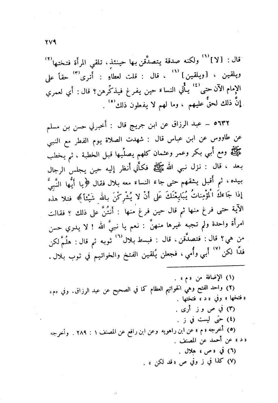 5632 - عَنِ ابْنِ جُرَيْجٍ قَالَ: أَخْبَرَنِي حَسَنُ بْنُ مُسْلِمٍ، عَنْ طَاوُسٍ، عَنِ ابْنِ عَبَّاسٍ قَالَ: شَهِدْتُ الصَّلَاةَ يَوْمَ الْفِطْرِ مَعَ النَّبِيِّ صَلَّى اللهُ عَلَيْهِ وَسَلَّمَ وَمَعَ أَبِي بَكْرٍ وَعُمَرَ وَعُثْمَانَ كُلُّهُمْ يُصَلِّيهَا قَبْلَ الْخُطْبَةِ ثُمَّ يَخْطُبُ بَعْدُ قَالَ: نَزَلَ نَبِيُّ اللَّهِ صَلَّى اللهُ عَلَيْهِ وَسَلَّمَ، فَكَأَنِّي أَنْظُرُ إِلَيْهِ حِينَ يَجْلِسُ الرِّجَالُ بِيَدِهِ، ثُمَّ أَقْبَلَ يَشُقُّهُمْ حَتَّى جَاءَ النِّسَاءَ مَعَهُ بِلَالٌ، فَقَالَ: {§يَا أَيُّهَا النَّبِيُّ إِذَا جَاءَكَ الْمُؤْمِنَاتُ يُبَايِعْنَكَ عَلَى أَنْ لَا يُشْرِكْنَ بِاللَّهِ شَيْئًا} [الممتحنة: 12] فَتَلَا هَذِهِ الْآيَةَ حَتَّى فَرَغَ مِنْهَا، ثُمَّ قَالَ حِينَ فَرَغَ مِنْهَا: «أَنْتُنَّ عَلَى ذَلِكَ»، فَقَالَتِ امْرَأَةٌ وَاحِدَةٌ وَلَمْ تُجِبْهُ غَيْرُهَا مِنْهُنَّ: نَعَمْ يَا نَبِيَّ اللَّهِ - لَا يَدْرِي حَسَنٌ مَنْ هِيَ - قَالَ: فَتَصَدَّقْنَ، قَالَ: فَبَسَطَ بِلَالٌ ثَوْبَهُ، ثُمَّ قَالَ: هَلُمَّ لَكُنَّ فِدًا لَكُنَّ أَبِي وَأُمِّي، فَجَعَلْنَ يُلْقِينَ الْفَتَخَ وَالْخَوَاتِيمَ فِي ثَوْبِ بِلَالٍ -[280]-، قُلْنَا لَهُ: مَا الْفَتَحُ؟ قَالَ: «خَوَاتِيمُ مِنْ عِظَامٍ كُنَّ يُلْبَسْنَ فِي الْجَاهِلِيَّةِ»