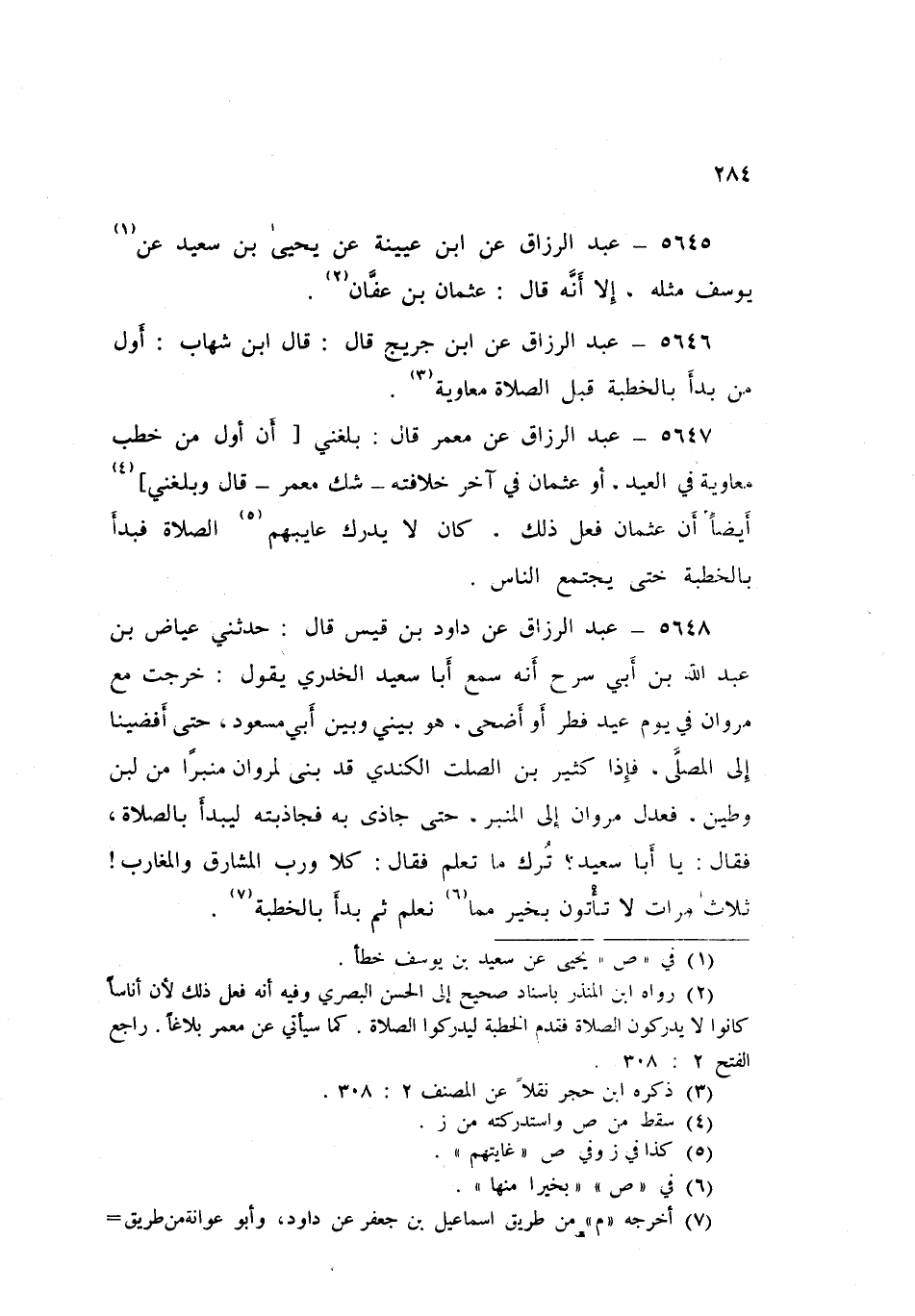 5647 - عَنْ مَعْمَرٍ قَالَ: بَلَغَنِي «أَنَّ §أَوَّلَ مَنْ خَطَبَ مُعَاوِيَةُ فِي الْعِيدِ أَوْ عُثْمَانُ فِي آخِرِ خِلَافَتِهِ» - شَكَّ مَعْمَرٌ - قَالَ: وَبَلَغَنِي أَيْضًا «أَنَّ عُثْمَانَ فَعَلَ ذَلِكَ، كَانَ لَا يُدْرِكُ غَايِبُهُمُ الصَّلَاةَ، فَبَدَأَ بِالْخُطْبَةِ حَتَّى يَجْتَمِعَ النَّاسُ»