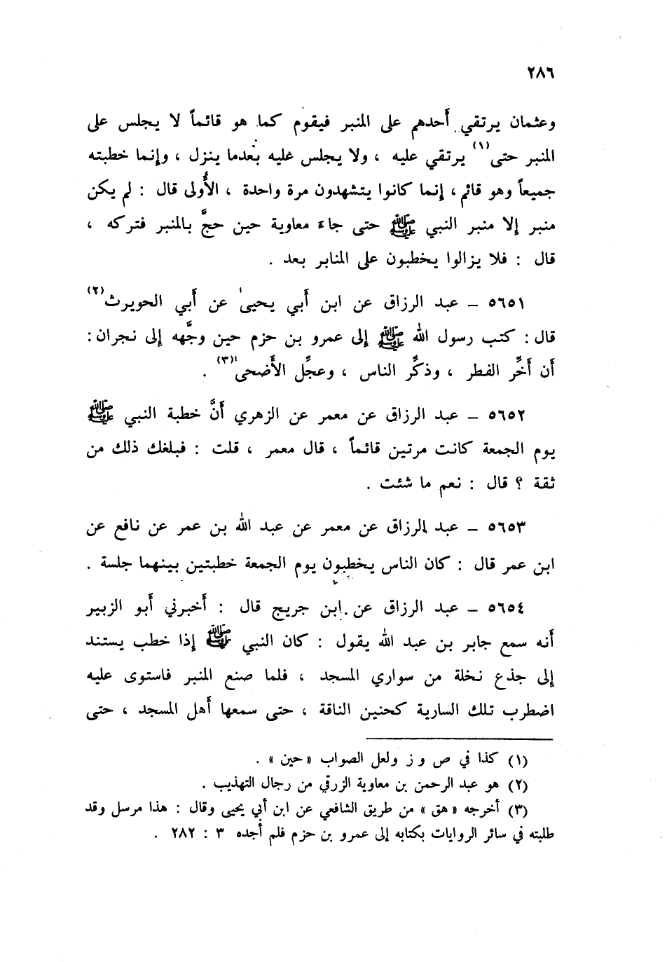 5654 - عَنِ ابْنِ جُرَيْجٍ قَالَ: أَخْبَرَنِي أَبُو الزُّبَيْرِ، أَنَّهُ سَمِعَ جَابِرَ بْنَ عَبْدِ اللَّهِ يَقُولُ: «كَانَ النَّبِيُّ صَلَّى اللهُ عَلَيْهِ وَسَلَّمَ §إِذَا خَطَبَ يَسْتَنِدُ إِلَى جِذْعِ نَخْلَةٍ مِنْ سَوَارِي الْمَسْجِدِ، فَلَمَّا صُنِعَ الْمِنْبَرُ فَاسْتَوَى عَلَيْهِ اضْطَرَبَ تِلْكَ السَّارِيَةُ كَحَنِينِ النَّاقَةِ حَتَّى سَمِعَهَا أَهْلُ الْمَسْجِدِ حَتَّى نَزَلَ رَسُولُ اللَّهِ صَلَّى اللهُ عَلَيْهِ وَسَلَّمَ، فَاعْتَنَقَهَا فَسَكَتَتْ»