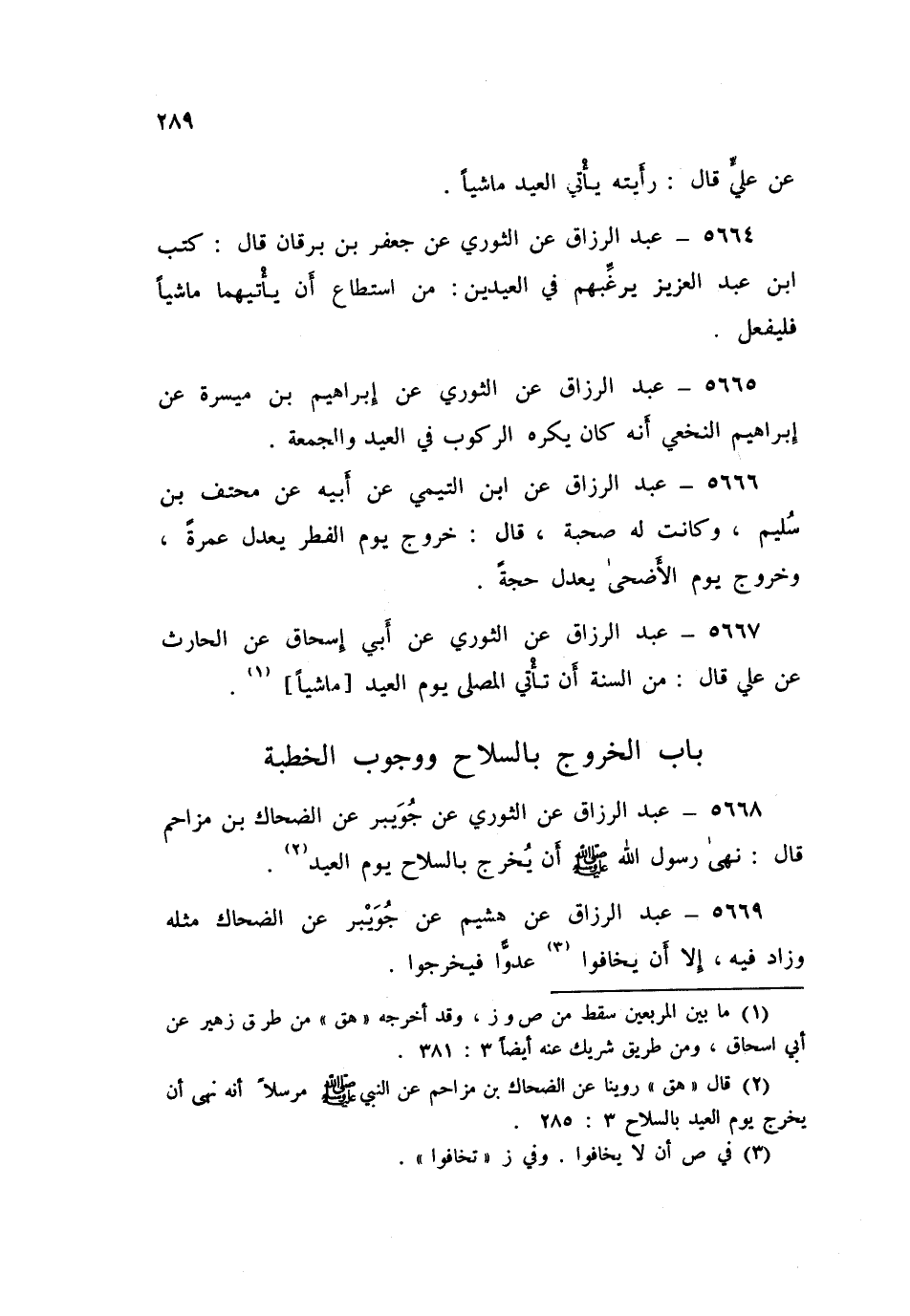 5668 - عَنِ الثَّوْرِيِّ، عَنْ جُوَيْبِرٍ، عَنِ الضَّحَّاكِ بْنِ مُزَاحِمٍ قَالَ: «§نَهَى رَسُولُ اللَّهِ صَلَّى اللهُ عَلَيْهِ وَسَلَّمَ، أَنْ يُخْرَجَ بِالسِّلَاحِ يَوْمَ الْعِيدِ». عَبْدُ الرَّزَّاقِ،