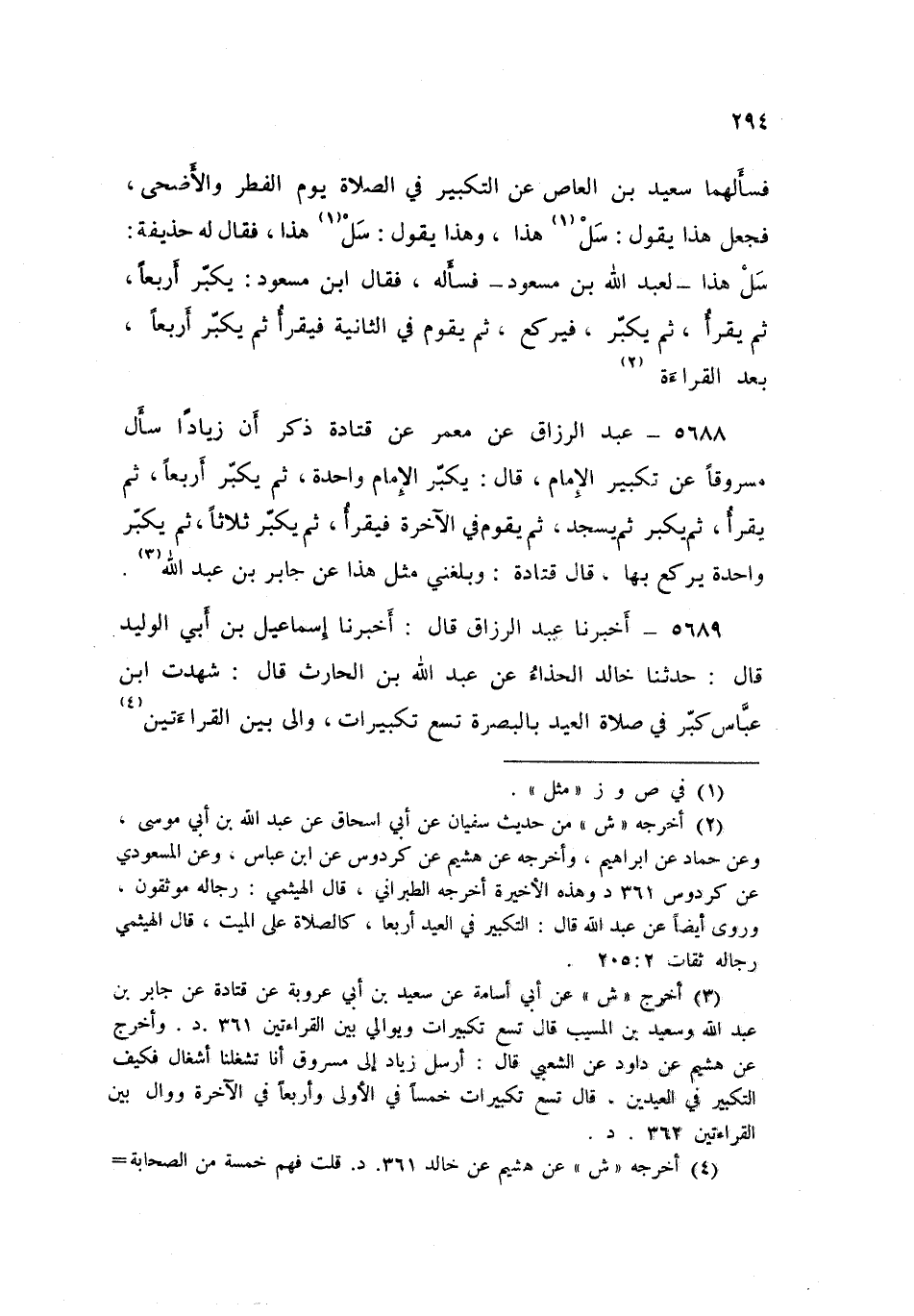 5689 - عَبْدُ الرَّزَّاقِ، قَالَ: أَخْبَرَنَا إِسْمَاعِيلُ بْنُ أَبِي الْوَلِيدِ قَالَ: حَدَّثَنَا خَالِدٌ الْحَذَّاءُ، عَنْ عَبْدِ اللَّهِ بْنِ الْحَارِثِ قَالَ: شَهِدْتُ ابْنَ عَبَّاسٍ «§كَبَّرَ فِي صَلَاةِ الْعِيدِ بِالْبَصْرَةِ تِسْعَ تَكْبِيرَاتٍ، وَالَى بَيْنَ الْقِرَاءَتَيْنِ» قَالَ: وَشَهِدْتُ الْمُغِيرَةَ بْنَ شُعْبَةَ فَعَلَ ذَلِكَ أَيْضًا. فَسَأَلْتُ خَالِدًا كَيْفَ فَعَلَ ابْنُ عَبَّاسٍ؟ فَفَسَّرَ لَنَا كَمَا صَنَعَ ابْنُ مَسْعُودٍ فِي حَدِيثِ مَعْمَرٍ وَالثَّوْرِيِّ عَنْ أَبِي إِسْحَاقَ سَوَاءً