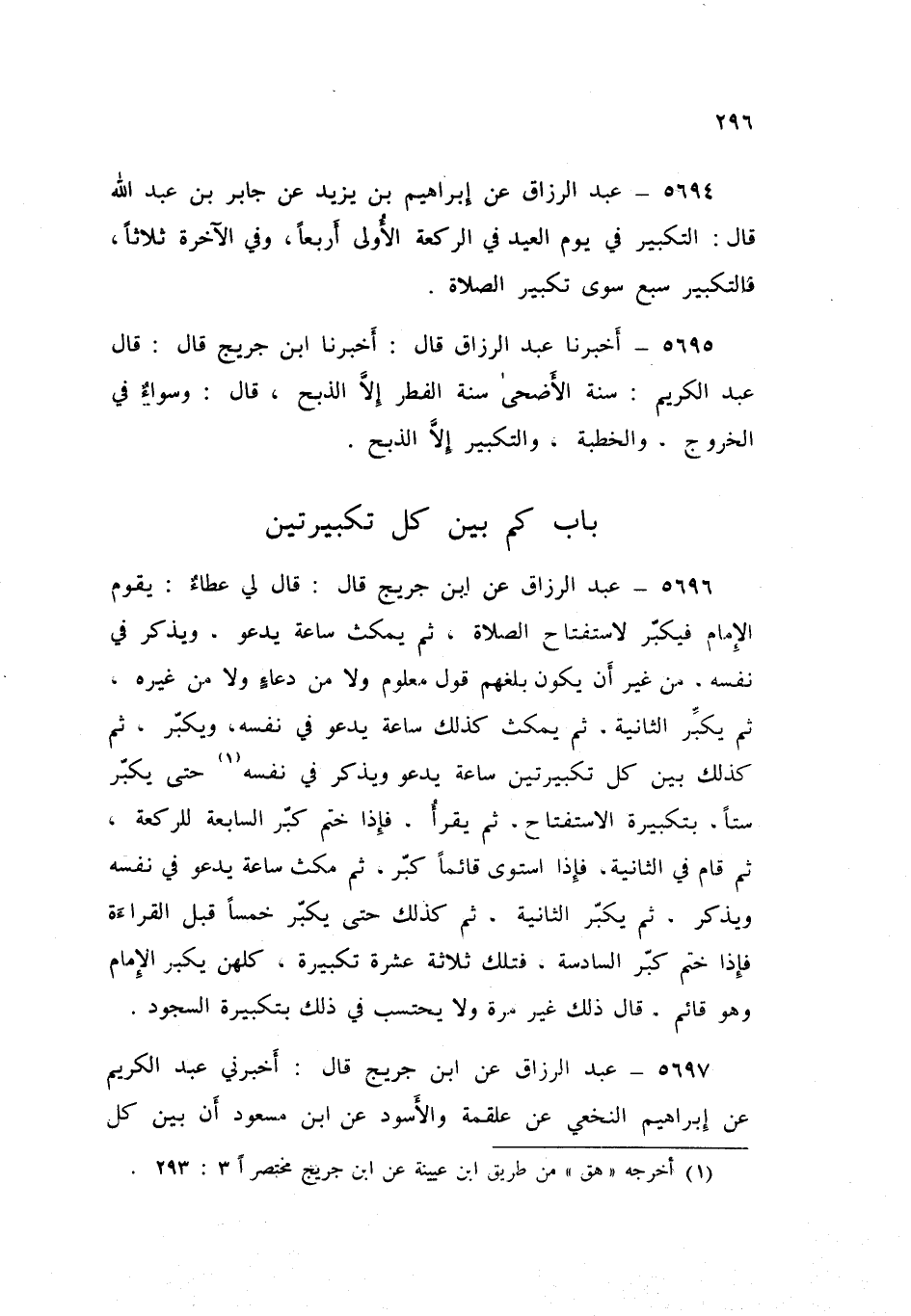 5697 - عَنِ ابْنِ جُرَيْجٍ قَالَ: أَخْبَرَنِي عَبْدُ الْكَرِيمِ، عَنْ إِبْرَاهِيمَ النَّخْعِيِّ، عَنْ عَلْقَمَةَ، وَالْأَسْوَدِ، عَنِ ابْنِ مَسْعُودٍ أَنَّ §بَيْنَ كُلِّ تَكْبِيرَتَيْنِ قَدْرُ كَلِمَةٍ "