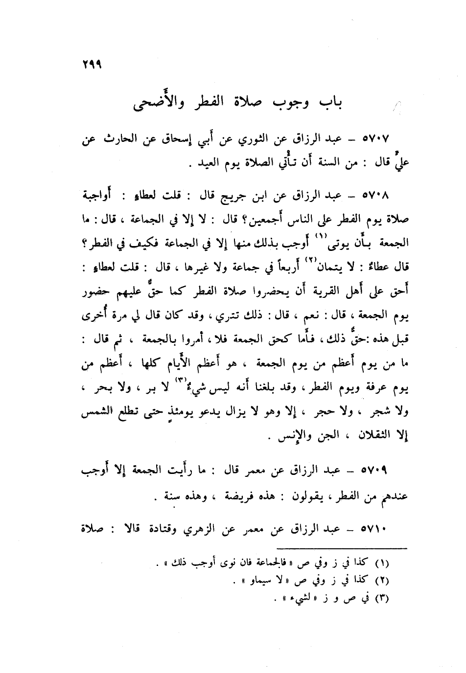 5708 - عَنِ ابْنِ جُرَيْجٍ قَالَ: قُلْتُ لِعَطَاءٍ: أَوَاجِبَةٌ صَلَاةُ يَوْمِ الْفِطْرِ عَلَى النَّاسِ أَجْمَعِينَ؟ قَالَ: «لَا، إِلَّا فِي الْجَمَاعَةِ» قَالَ: مَا الْجُمُعَةُ بِأَنْ يُوتَى أَوْجَبُ بِذَلِكَ مِنْهَا إِلَّا فِي الْجَمَاعَةِ فَكَيْفَ فِي الْفِطْرِ؟ " قَالَ عَطَاءٌ: «لَا يَتِمَّانِ أَرْبَعًا فِي جَمَاعَةٍ وَلَا غَيْرِهَا» قَالَ: قُلْتُ لِعَطَاءٍ: «أَحَقٌّ عَلَى أَهْلِ الْقَرْيَةِ أَنْ يَحْضُرُوا صَلَاةَ الْفِطْرِ كَمَا حَقَّ عَلَيْهِمْ حُضُورُ يَوْمِ الْجُمُعَةِ؟» قَالَ: «نَعَمْ» قَالَ: ذَلِكَ تَتْرَى وَقَدْ كَانَ قَالَ لِي مَرَّةً أُخْرَى قَبْلَ هَذِهِ: حَقَّ ذَلِكَ، فَأَمَّا كَحَقِّ الْجُمُعَةِ فَلَا، أُمِرُوا بِالْجُمُعَةِ، ثُمَّ قَالَ: «§مَا مِنْ يَوْمٍ أَعْظَمُ مِنْ يَوْمِ الْجُمُعَةِ، هُوَ أَعْظَمُ الْأَيَّامِ كُلِّهَا، أَعْظَمُ مِنْ يَوْمِ عَرَفَةَ وَيَوْمِ الْفِطْرِ، وَقَدْ بَلَغَنَا أَنَّهُ لَيْسُ شَيءٌ لَا بَرٌّ وَلَا بَحْرٌ وَلَا شَجَرٌ وَلَا حَجَرٌ إِلَّا وَهُوَ لَا يَزَالُ يَدْعُو يَوْمَئِذٍ حَتَّى تَطْلُعَ الشَّمْسُ إِلَّا الثَّقَلَانِ الْجِنَّ وَالْإِنْسَ»
