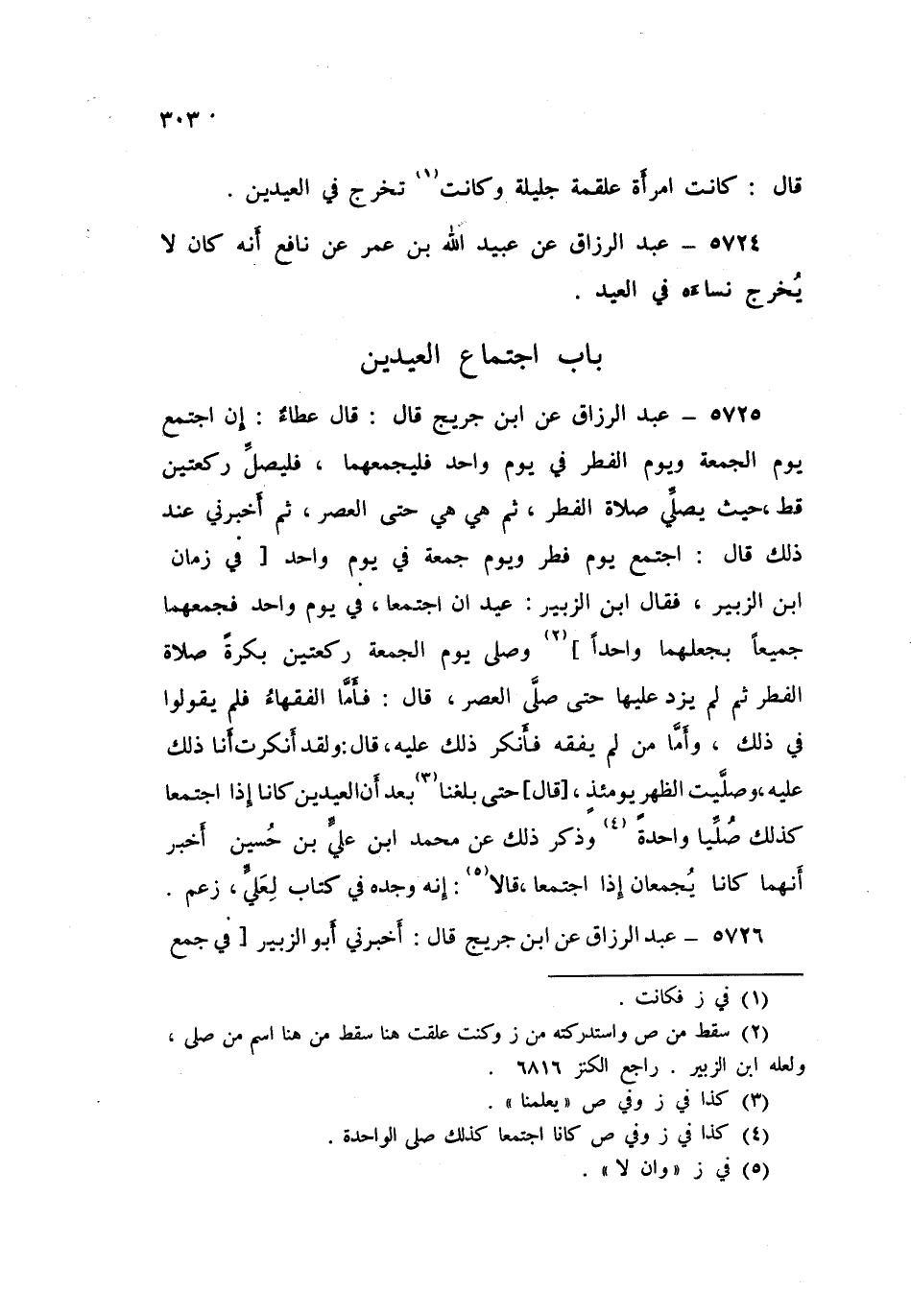 5725 - عَنِ ابْنِ جُرَيْجٍ قَالَ: قَالَ عَطَاءٌ: «إِنِ §اجْتَمَعَ يَوْمُ الْجُمُعَةِ وَيَوْمُ الْفِطْرِ فِي يَوْمٍ وَاحِدٍ فَلْيَجْمَعْهُمَا فَلْيُصَلِّ رَكْعَتَيْنِ قَطُّ حَيْثُ يُصَلِّي صَلَاةَ الْفِطْرِ ثُمَّ هِيَ هِيَ حَتَّى الْعَصْرِ» ثُمَّ أَخْبَرَنِي عِنْدَ ذَلِكَ قَالَ: " اجْتَمَعَ يَوْمُ فِطْرٍ وَيَوْمُ جُمُعَةٍ فِي يَوْمٍ وَاحِدٍ فِي زَمَانِ ابْنِ الزُّبَيْرِ، فَقَالَ ابْنُ الزُّبَيْرِ: عِيدَانِ اجْتَمَعَا فِي يَوْمٍ وَاحِدٍ فَجَمَعَهُمَا جَمِيعًا بِجَعْلِهِمَا وَاحِدًا، وَصَلَّى يَوْمَ الْجُمُعَةِ رَكْعَتَيْنِ بُكْرَةَ صَلَاةَ الْفِطْرِ، ثُمَّ لَمْ يَزِدْ عَلَيْهَا حَتَّى صَلَّى الْعَصْرَ ". قَالَ: «فَأَمَّا الْفُقَهَاءُ فَلَمْ يَقُولُوا فِي ذَلِكَ، وَأَمَّا مَنْ لَمْ يَفْقَهْ فَأَنْكَرَ ذَلِكَ عَلَيْهِ». قَالَ: «وَلَقَدْ أَنْكَرْتُ أَنَا ذَلِكَ عَلَيْهِ وَصَلَّيْتُ الظُّهْرَ يَوَمَئِذٍ». قَالَ: «حَتَّى بَلَغَنَا بَعْدُ أَنَّ الْعِيدَيْنِ كَانَا إِذَا اجْتَمَعَا كَذَلِكَ صُلِّيَا وَاحِدَةً»، وَذُكِرَ ذَلِكَ عَنْ مُحَمَّدِ بْنِ عَلِيِّ بْنِ حُسَيْنٍ أَخْبَرَ أَنَّهُمَا كَانَا يَجْمَعَانِ إِذَا اجْتَمَعَا. قَالَا: إِنَّهُ وَجَدَهُ فِي كِتَابٍ لِعَلِيٍّ، زَعَمَ