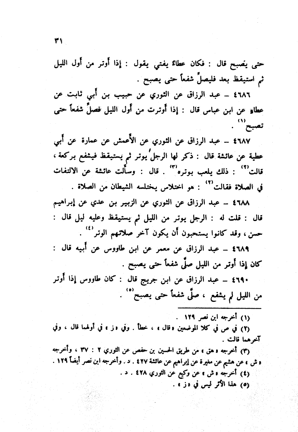 4691 - عَنِ ابْنِ جُرَيْجٍ قَالَ: كَانَ طَاوُسٌ «§إِذَا أَوْتَرَ مِنَ اللَّيْلِ لَمْ يَشْفَعْ، وَرُبَّمَا أَوْتَرَ أَوَّلَهُ مَرَّةً وَاحِدَةً وَآخِرَهُ مَرَّةً أُخْرَى»، ذَكَرَه عَنْ أَبِيه