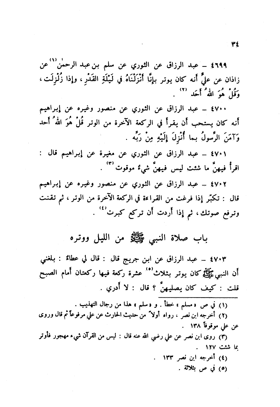4703 - عَنِ ابْنِ جُرَيْجٍ قَالَ: قَالَ لِي عَطَاءٌ: «بَلَغَنِي أَنَّ النَّبِيَّ صَلَّى اللهُ عَلَيْهِ وَسَلَّمَ كَانَ §يُوتِرُ بِثَلَاثَ عَشْرَةَ رَكْعَةً، فِيهَا رَكْعَتَانِ أَمَامَ الصُّبْحِ»، قُلْتُ: كَيْفَ كَانَ يُصَلِّيهِنَّ؟ قَالَ: «لَا أَدْرِي»