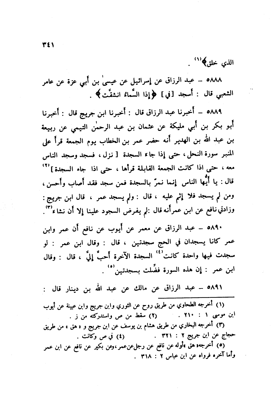 5889 - عَبْدُ الرَّزَّاقِ، قَالَ: أَخْبَرَنَا ابْنُ جُرَيْجٍ قَالَ: أَخْبَرَنَا أَبُو بَكْرِ بْنِ أَبِي مُلَيْكَةَ، عَنْ عُثْمَانَ بْنِ عَبْدِ الرَّحْمَنِ التَّيْمِيِّ، عَنْ رَبِيعَةَ بْنِ عَبْدِ اللَّهِ بْنِ الْهُدَيْرِ، أَنَّهُ حَضَرَ عُمَرُ بْنُ الْخَطَّابِ يَوْمَ الْجُمُعَةِ قَرَأَ عَلَى الْمِنْبَرِ سُورَةَ النَّحْلِ حَتَّى إِذَا جَاءَ السَّجْدَةُ، نَزَلَ فَسَجَدَ، وَسَجَدَ النَّاسُ مَعَهُ، حَتَّى إِذَا كَانَتِ الْجُمُعَةُ الْقَابِلَةُ قَرَأَهَا حَتَّى إِذَا جَاءَ السَّجْدَةُ قَالَ: «يَا أَيُّهَا النَّاسُ، §إِنَّمَا نَمَرُّ بِالسَّجْدَةِ فَمَنْ سَجَدَ فَقَدْ أَصَابَ وَأَحْسَنَ، وَمَنْ لَمْ يَسْجُدْ فَلَا إِثْمَ عَلَيْهِ» قَالَ: " وَلَمْ يَسْجُدْ عُمَرُ. قَالَ ابْنُ جُرَيْجٍ: وَزَادَنِي نَافِعٌ، عَنِ ابْنِ عُمَرَ أَنَّهُ قَالَ: «لَمْ يُفْرَضِ السُّجُودُ عَلَيْنَا إِلَّا أَنْ نَشَاءُ»
