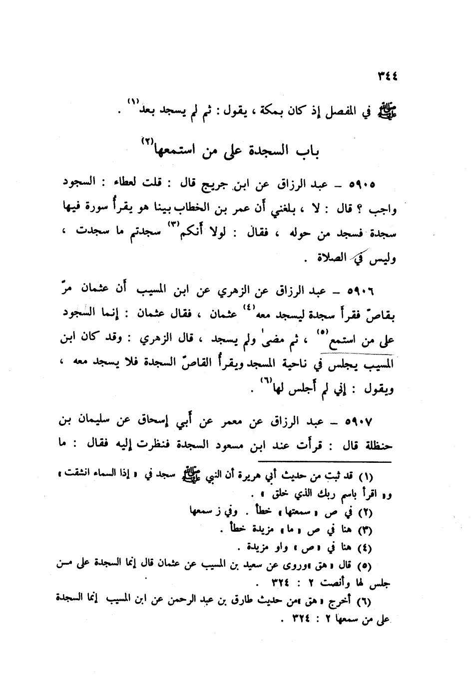 5906 - عَنِ الزُّهْرِيِّ، عَنِ ابْنِ الْمُسَيِّبِ، أَنَّ عُثْمَانَ، مَرَّ بِقَاصٍّ فَقَرَأَ سَجْدَةً لِيَسْجُدَ مَعَهُ عُثْمَانُ، فَقَالَ عُثْمَانُ: «إِنَّمَا §السُّجُودُ عَلَى مَنِ اسْتَمَعَ» ثُمَّ مَضَى وَلَمْ يَسْجُدْ. قَالَ الزُّهْرِيُّ: وَقَدْ كَانَ ابْنُ الْمُسَيِّبِ يَجْلِسُ فِي نَاحِيَةِ الْمَسْجِدِ وَيَقْرَأُ الْقَاصُّ السَّجْدَةَ فَلَا يَسْجُدُ مَعَهُ، وَيَقُولُ: إِنِّي لَمْ أَجْلِسْ لَهَا