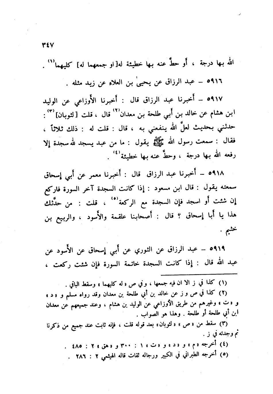 5917 - عَبْدُ الرَّزَّاقِ قَالَ: أَخْبَرَنَا الْأَوْزَاعِيُّ، عَنِ الْوَلِيدِ بْنِ هِشَامٍ، عَنْ خَالِدِ بْنِ أَبِي طَلْحَةَ بْنِ مَعْدَانَ قَالَ: قُلْتُ لِثَوْبَانَ حَدِّثْنِي بِحَدِيثٍ لَعَلَّ اللَّهَ يَنْفَعُنِي بِهِ قَالَ: قُلْتُ لَهُ ذَلِكَ ثَلَاثًا، فَقَالَ: سَمِعْتُ رَسُولَ اللَّهِ صَلَّى اللهُ عَلَيْهِ وَسَلَّمَ يَقُولُ: «§مَا مِنْ عَبْدٍ يَسْجُدُ لِلَّهِ سَجْدَةً إِلَّا رَفَعَهُ اللَّهُ بِهَا دَرَجَةً وَحَطَّ عَنْهُ بِهَا خَطِيئَةً»