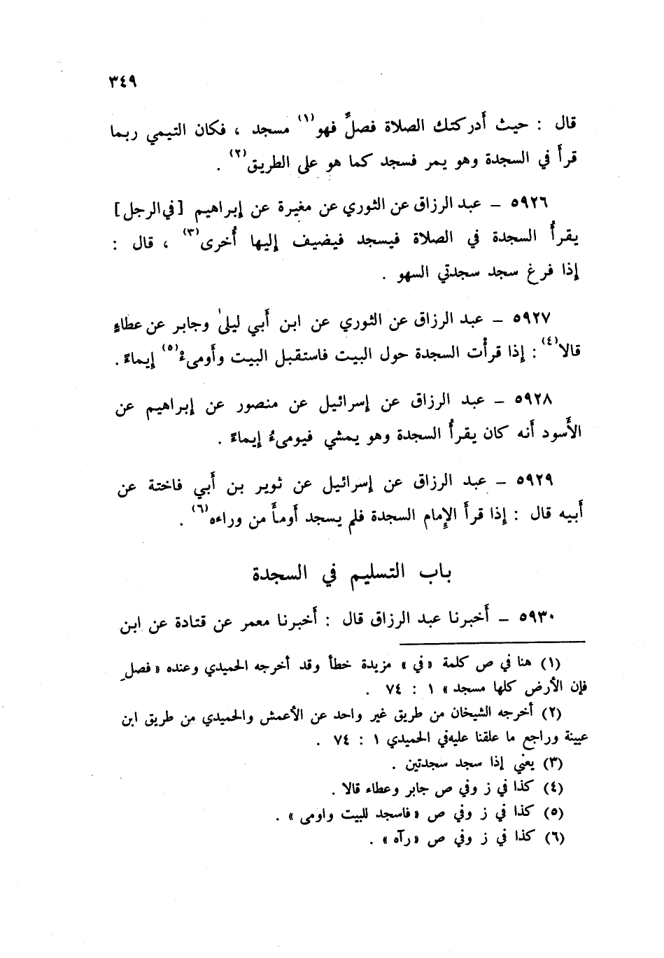 5931 - عَنِ الثَّوْرِيِّ، عَنِ الْحَكَمِ بْنِ عُتَيْبَةَ، عَنْ أَبِي الْأَحْوَصِ أَنَّهُ كَانَ §يُسَلِّمُ فِي السَّجْدَةِ "