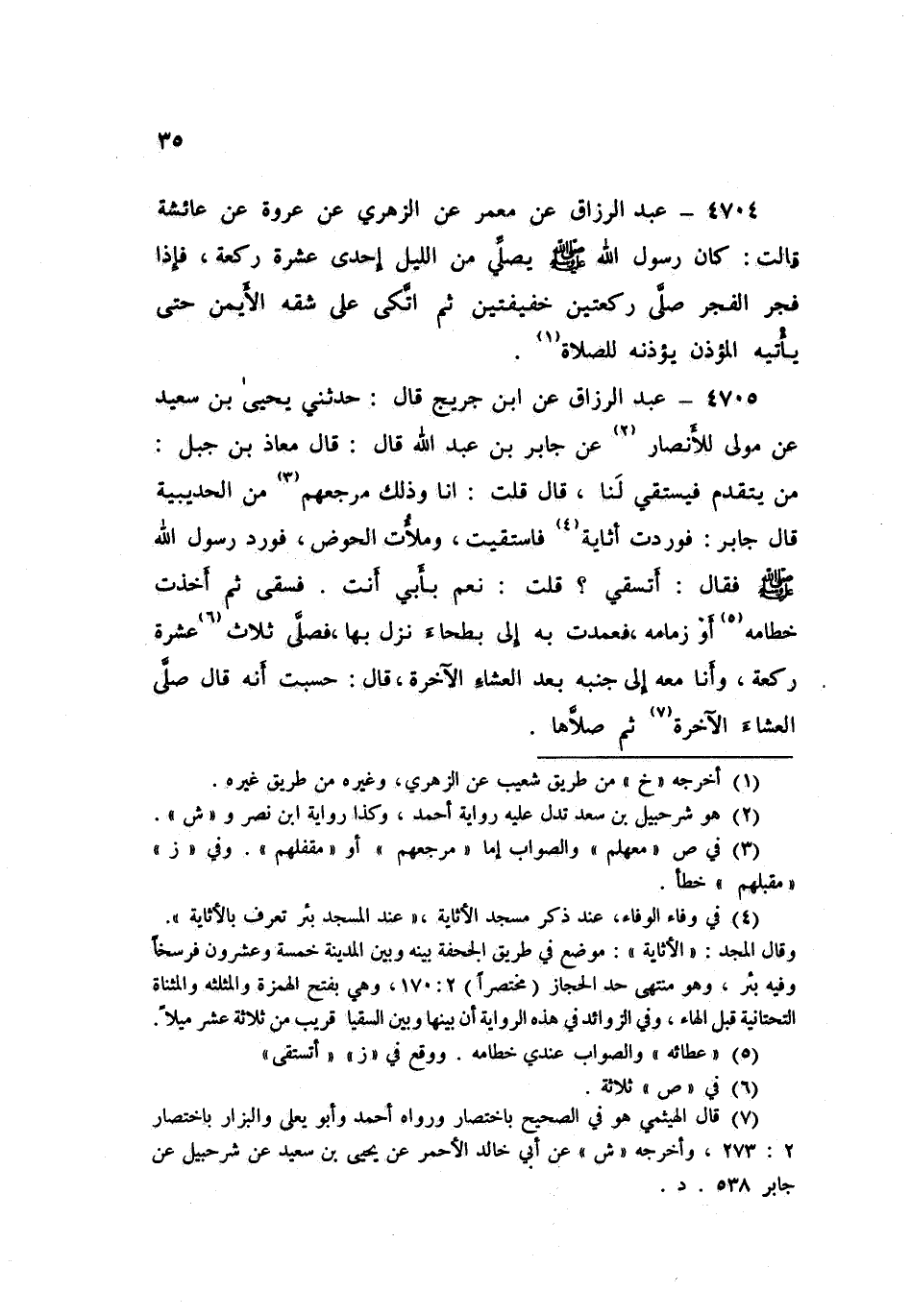 4705 - عَنِ ابْنِ جُرَيْجٍ قَالَ: حَدَّثَنِي يَحْيَى بْنُ سَعِيدٍ، عَنْ مَوْلَى لِلْأَنْصَارِ، عَنْ جَابِرِ بْنِ عَبْدِ اللَّهِ قَالَ: قَالَ مُعَاذُ بْنُ جَبَلٍ: مَنْ يَتَقَدَّمُ فَيَسْتَقِي لَنَا؟ قَالَ: قُلْتُ: أَنَا، وَذَلِكَ مَرْجِعَهُمْ مِنَ الْحُدَيْبِيَةِ، قَالَ جَابِرٌ: فَوَرَدْتُ أَثَايَةَ فَاسْتَقَيْتُ وَمَلَأْتُ الْحَوْضَ، فَوَرَدَ رَسُولُ اللَّهِ صَلَّى اللهُ عَلَيْهِ وَسَلَّمَ فَقَالَ: «أَتَسْقِي؟» قُلْتُ: نَعَمْ، بِأَبِي أَنْتَ، فَسَقَى ثُمَّ أَخَذْتُ خِطَامَهُ أَوْ زِمَامَهُ، فَعَمَدْتُ بِهِ إِلَى بَطْحَاءَ نَزَلَ بِهَا §فَصَلَّى ثَلَاثَ عَشْرَةَ رَكْعَةً وَأَنَا مَعَهُ إِلَى جَنْبِهِ بَعْدَ الْعِشَاءِ الْآخِرَةِ قَالَ: حَسِبْتُ أَنَّهُ قَالَ: صَلَّى الْعِشَاءَ الْآخِرَةَ ثُمَّ صَلَّاهَا