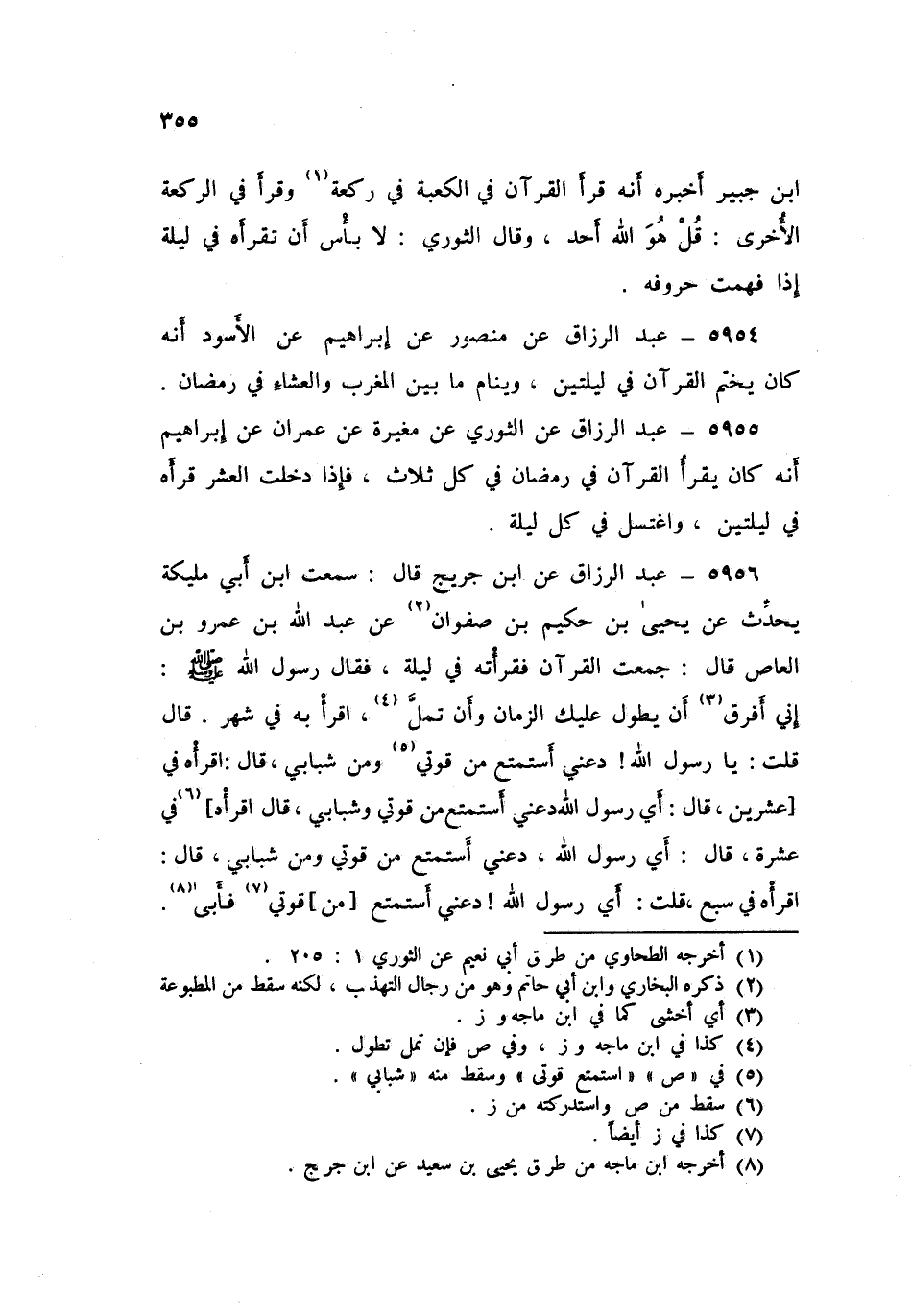 5956 - عَنِ ابْنِ جُرَيْجٍ قَالَ: سَمِعْتُ ابنَ أَبِي مُلَيْكَةَ يُحَدِّثُ عَنْ يَحْيَى بْنِ حَكِيمِ بْنِ صَفْوَانَ، عَنْ عَبْدِ اللَّهِ بْنِ عَمْرِو بْنِ الْعَاصِ قَالَ: جَمَعْتُ الْقُرْآنَ فَقَرَأْتُهُ فِي لَيْلَةٍ، فَقَالَ رَسُولُ اللَّهِ صَلَّى اللهُ عَلَيْهِ وَسَلَّمَ: «§إِنِّي أَفْرَقُ أَنْ يَطُولَ عَلَيْكَ الزَّمَانُ وَأَنْ تَمَلَّ، اقْرَأْ بِهِ فِي شَهْرٍ» قَالَ: قُلْتُ: يَا رَسُولَ اللَّهِ دَعْنِي أَسْتَمْتِعُ مِنْ قُوَّتِي وَمِنْ شَبَابِي قَالَ: «اقْرَأْهُ فِي عِشْرِينَ» قَالَ: أَيْ رَسُولَ اللَّهِ، دَعْنِي أَسْتَمْتِعُ مِنْ قُوَّتِي وَشَبَابِي قَالَ: «اقْرَأْهُ فِي عَشَرَةٍ» قَالَ: أَيْ رَسُولَ اللَّهِ، دَعْنِي أَسْتَمْتِعُ مِنْ قُوَّتِي وَمِنْ شَبَابِي قَالَ: «اقْرَأْهُ فِي سَبْعٍ» قُلْتُ: أَيْ رَسُولَ اللَّهِ: دَعْنِي أَسْتَمْتِعُ مِنْ قُوَّتِي، فَأَبَى