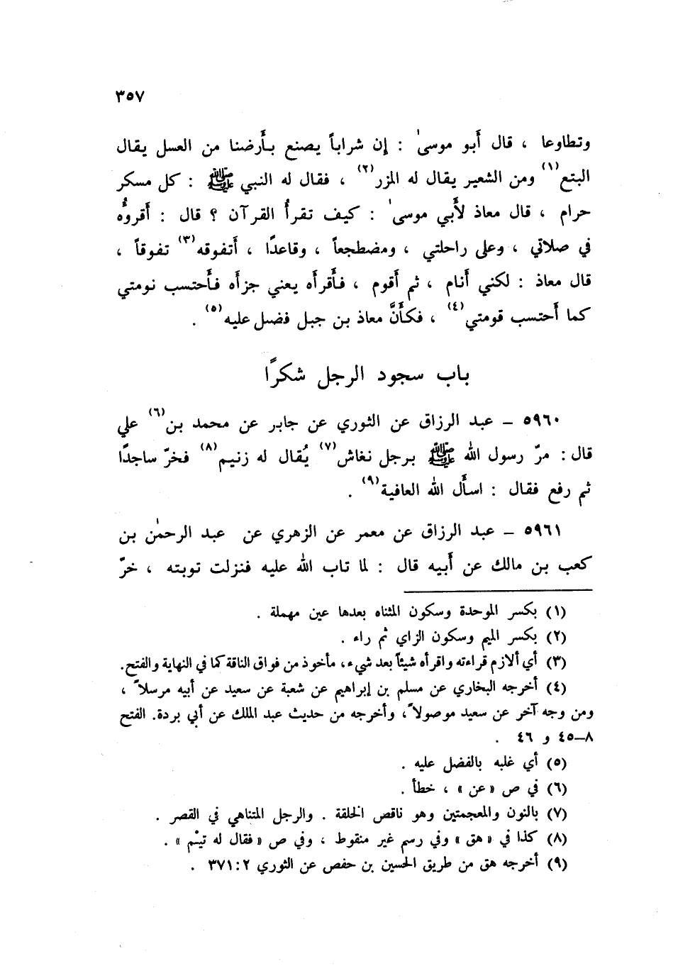 5960 - عَنِ الثَّوْرِيِّ، عَنْ جَابِرٍ، عَنْ مُحَمَّدِ بْنِ عَلِيٍّ قَالَ: مَرَّ رَسُولُ اللَّهِ صَلَّى اللهُ عَلَيْهِ وَسَلَّمَ بِرَجُلٍ نَغَّاشٍ يُقَالُ لَهُ: زَنِيمْ فَخَرَّ سَاجِدًا، ثُمَّ رَفَعَ، فَقَالَ: «§أَسْأَلُ اللَّهَ الْعَافِيَةَ»