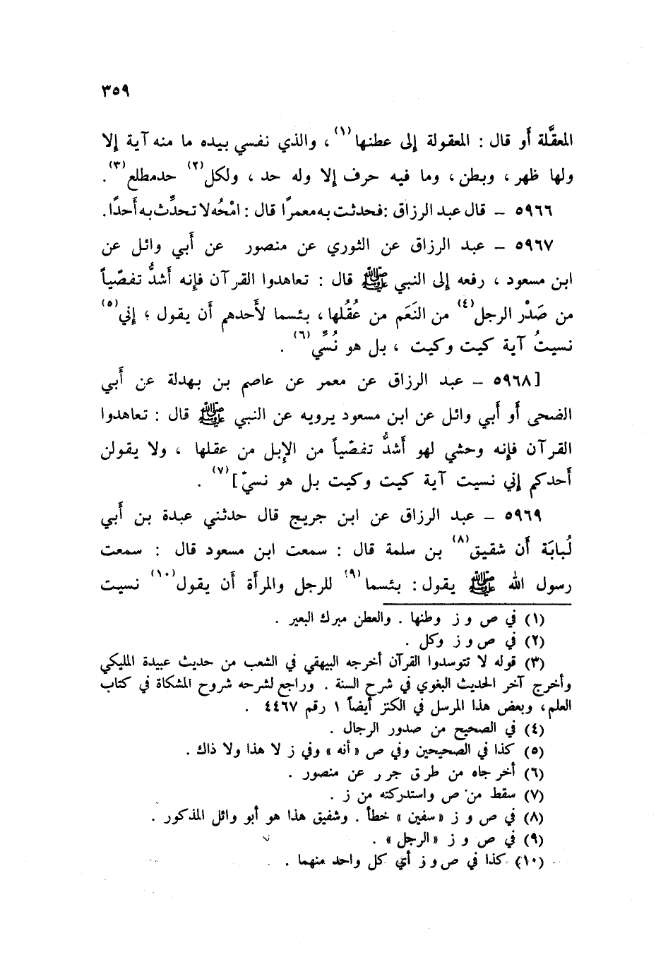 5968 - عَنْ مَعْمَرٍ، عَنْ عَاصِمِ بْنِ بَهْدَلَةَ، عَنْ أَبِي الضُّحَى، أَوْ أَبِي وَائِلٍ، عَنِ ابْنِ مَسْعُودٍ، يَرْوِيهِ عَنِ النَّبِيِّ ـ صَلَّى اللهُ عَلَيْهِ وَسَلَّمَ ـ قَالَ: «§تَعَاهَدُوا الْقُرْآنَ فَإِنَّهُ وَحْشِيٌّ، لَهُوَ أَشَدُّ تَفَصِّيًا مِنَ الْإِبِلِ مِنْ عُقُلِهَا، وَلَا يَقُولَنَّ أَحَدُكُمْ إِنِّي نَسِيتُ آيَةَ كَيْتَ وَكَيْتَ بَلْ هُوَ نُسِّيَ»