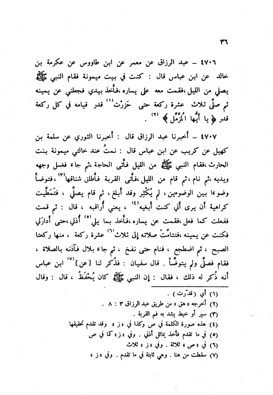 4707 - عَبْدُ الرَّزَّاقِ، قَالَ: أَخْبَرَنَا الثَّوْرِيُّ، عَنْ سَلَمَةَ بْنِ كُهَيْلٍ، عَنْ كُرَيْبٍ، عَنِ ابْنِ عَبَّاسٍ قَالَ: " نِمْتُ عِنْدَ خَالَتِي مَيْمُونَةَ بِنْتِ الْحَارِثِ فَقَامَ النَّبِيُّ صَلَّى اللهُ عَلَيْهِ وَسَلَّمَ مِنَ اللَّيْلِ، فَأَتَى الْحَاجَةَ ثُمَّ جَاءَ فَغَسَلَ وَجْهَهُ وَيَدَيْهِ، ثُمَّ نَامَ، ثُمَّ قَامَ مِنَ اللَّيْلِ فَأَتَى الْقِرْبَةَ فَأَطْلَقَ شِنَاقَهَا، فَتَوَضَّأَ وُضُوءًا بَيْنَ الْوُضُوءَيْنِ لَمْ يُكْثِرْ وَقَدْ أَبْلَغَ، ثُمَّ قَامَ يُصَلِّي فَتَمَطَّيْتُ كرَاهِيَةَ أَنْ يَرَى أَنِّي كُنْتُ أَبْغِيهِ يَعْنِي أُرَاقِبُهُ قَالَ: ثُمَّ قُمْتُ فَفَعَلْتُ كَمَا فَعَلَ، فَقُمْتُ عَنْ يَسَارِهِ، فَأَخَذَ بِمَا يَلِي أُذُنِي حَتَّى أَدَارَنِي فَكُنْتُ عَنْ يَمِينِهِ، §فَتَتَامَّتْ صَلَاتُهُ إِلَى ثَلَاثَ عَشْرَةَ رَكْعَةً مِنْهَا رَكْعَتَا الصُّبْحِ، ثُمَّ اضْطَجَعَ فَنَامَ حَتَّى نَفَخَ، ثُمَّ جَاءَ بِلَالٌ فَآذَنَهُ بِالصَّلَاةِ، فَقَامَ فَصَلَّى وَلَمْ يَتَوَضَّأْ "