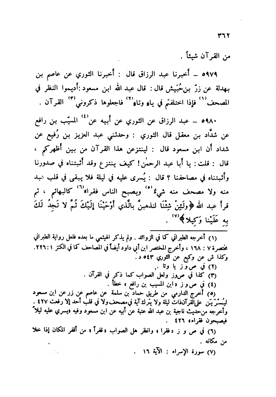 5980 - عَنِ الثَّوْرِيِّ، عَنْ أَبِيهِ، عَنِ الْمُسَيِّبِ بْنِ رَافِعٍ، عَنْ شَدَّادِ بْنِ مَعْقِلٍ، قَالَ الثَّوْرِيُّ: وَحَدَّثَنِي عَبْدُ الْعَزِيزِ بْنُ رُفَيْعٍ، عَنْ شَدَّادٍ، أَنَّ ابْنَ مَسْعُودٍ قَالَ: «لَيُنْتَزَعَنَّ هَذَا الْقُرْآنُ مِنْ بَيْنَ أَظْهُرِكُمْ» قَالَ: قُلْتُ: يَا أَبَا عَبْدِ الرَّحْمَنِ، كَيْفَ يُنْتَزَعُ وَقَدْ أَثْبَتْنَاهُ فِي صُدُورِنَا وَأَثْبَتْنَاهُ فِي مَصَاحِفِنَا؟ قَالَ: " يُسْرَى عَلَيْهِ فِي لَيْلَةٍ فَلَا يَبْقَى فِي قَلْبِ عَبْدٍ مِنْهُ وَلَا مُصْحَفٍ مِنْهُ شَيءٌ، وَيُصْبِحُ النَّاسُ فُقَرَاءَ كَالْبَهَائِمِ، ثُمَّ قَرَأَ عَبْدُ اللَّهِ {§وَلَئِنْ شِئْنَا لَنَذْهَبَنَّ بِالَّذِي أَوْحَيْنَا إِلَيْكَ ثُمَّ لَا تَجِدُ لَكَ بِهِ عَلَيْنَا وَكِيلَا} [الإسراء: 86] "