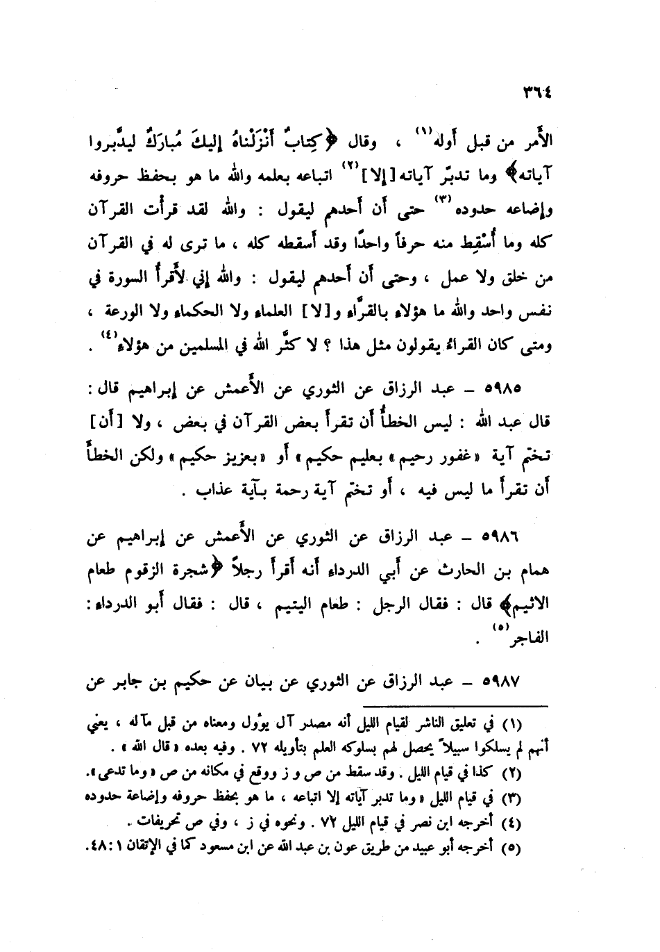 5987 - عَنِ الثَّوْرِيِّ، عَنْ بَيَانٍ، عَنْ حَكِيمِ بْنِ جَابِرٍ، عَنْ أَبِي الدَّرْدَاءِ قَالَ: «§أَقْرَأُ النَّاسِ لَهَذَا الْقُرْآنِ الْمُنَافِقُ لَا يَذَرُ مِنْهُ أَلِفًا وَلَا وَاوًا يَلُفُّهُ بِلِسَانٍ كَمَا تَلُفُّ الْبَقَرَةُ الْكَلَأَ بِلِسَانِهَا»