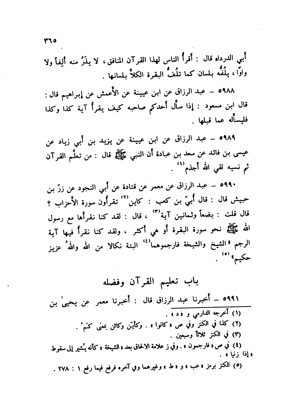 5990 - عَنْ مَعْمَرٍ، عَنْ قَتَادَةَ، عَنْ أَبِي النَّجُودِ، عَنْ زِرِّ بْنِ حُبَيْشٍ قَالَ: قَالَ أُبَيُّ بْنُ كَعْبٍ: «§كَأَيِّنْ تَقْرَءُونَ سُورَةَ الْأَحْزَابِ؟» قَالَ: قُلْتُ: بِضْعًا وَثَمَانِينَ آيَةً قَالَ: " لَقَدْ كُنَّا نَقْرَأُهَا مَعَ رَسُولِ اللَّهِ صَلَّى اللهُ عَلَيْهِ وَسَلَّمَ نَحْوَ سُورَةِ الْبَقَرَةِ أَوْ هِيَ أَكْثَرُ، وَلَقَدْ كُنَّا نَقْرَأُ فِيهَا آيَةَ الرَّجْمِ: «الشَّيْخُ وَالشَّيْخَةُ فَارْجُمُوهُمَا أَلْبَتَّةَ نَكَالًا مِنَ اللَّهِ وَاللَّهُ عَزِيزٌ حَكِيمٌ»