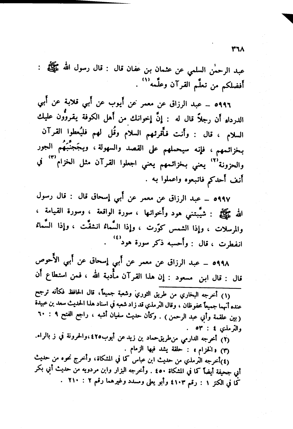 5998 - عَنْ مَعْمَرٍ، عَنْ أَبِي إِسْحَاقَ، عَنْ أَبِي الْأَحْوَصِ قَالَ: قَالَ ابْنُ مَسْعُودٍ: «إِنَّ هَذَا §الْقُرْآنَ مَأْدُبَةُ اللَّهِ، فَمَنِ اسْتَطَاعَ أَنْ يَتَعَلَّمَ مِنْهُ شَيْئًا فَلْيَفْعَلْ، فَإِنَّ أَصْفَرَ الْبُيُوتِ مِنَ الْخَيْرِ الْبَيْتُ الَّذِي لَيْسَ فِيهِ مِنْ كِتَابِ اللَّهِ تَعَالَى شَيءٌ، وَإِنَّ الْبَيْتَ الَّذِي لَيْسَ فِيهِ مِنْ كِتَابِ اللَّهِ شَيءٌ خَرِبٌ كَخَرَابِ الْبَيْتِ الَّذِي لَا عَامِرَ لَهُ، وَإِنَّ الشَّيْطَانَ يَخْرُجُ مِنَ الْبَيْتِ يَسْمَعُ سُورَةَ الْبَقَرَةِ تُقْرَأُ فِيهِ»