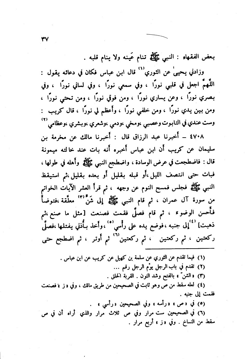 4708 - عَبْدُ الرَّزَّاقِ، أَخْبَرَنَا مَالِكٌ، عَنْ مَخْرَمَةَ بْنِ سُلَيْمَانَ، عَنْ كُرَيْبٍ، أَنَّ ابْنَ عَبَّاسٍ، أَخْبَرَهُ أَنَّهُ بَاتَ عِنْدَ خَالَتِهِ مَيْمُونَةَ قَالَ: فَاضْطَجَعْتُ فِي عَرْضِ الْوِسَادَةِ، وَاضْطَجَعَ النَّبِيُّ صَلَّى اللهُ عَلَيْهِ وَسَلَّمَ وَأَهْلُهُ فِي طُولِهَا، فَبَاتَ حَتَّى انْتَصَفَ اللَّيْلُ أَوْ قَبْلَهُ بِقَلَيْلٍ أَوْ بَعْدَهُ بِقَلَيْلٍ، ثُمَّ اسْتَيْقَظَ النَّبِيُّ صَلَّى اللهُ عَلَيْهِ وَسَلَّمَ فَجَلَسَ فَمَسَحَ النَّوْمَ عَنْ وَجْهِهِ ثُمَّ §قَرَأَ الْعَشْرَ الْآيَاتِ الْخَوَاتِمَ مِنْ سُورَةِ آلِ عِمْرَانَ، ثُمَّ قَامَ النَّبِيُّ صَلَّى اللهُ عَلَيْهِ وَسَلَّمَ إِلَى شَنٍّ مُعَلَّقَةٍ فَتَوَضَّأَ فَأَحْسَنَ الْوُضُوءَ، ثُمَّ قَامَ فَصَلَّى فَقُمْتُ فَصَنَعْتُ مِثْلَ مَا صَنَعَ، ثُمَّ ذَهَبْتُ إِلَى جَنْبِهِ فَوَضَعَ يَدَهُ عَلَى رَأْسِي وَأَخَذَ بِأُذُنِي يَفْتِلُهَا، فَصَلَّى رَكْعَتَيْنِ، ثُمَّ رَكْعَتَيْنِ، ثُمَّ رَكْعَتَيْنِ، ثُمَّ أَوْتَرَ، ثُمَّ اضْطَجَعَ حَتَّى -[38]- جَاءَهُ الْمُؤَذِّنُ، ثُمَّ قَامَ فَصَلَّى رَكْعَتَيْنِ خَفِيفَتَيْنِ، ثُمَّ خَرَجَ فَصَلَّى الصُّبْحَ "