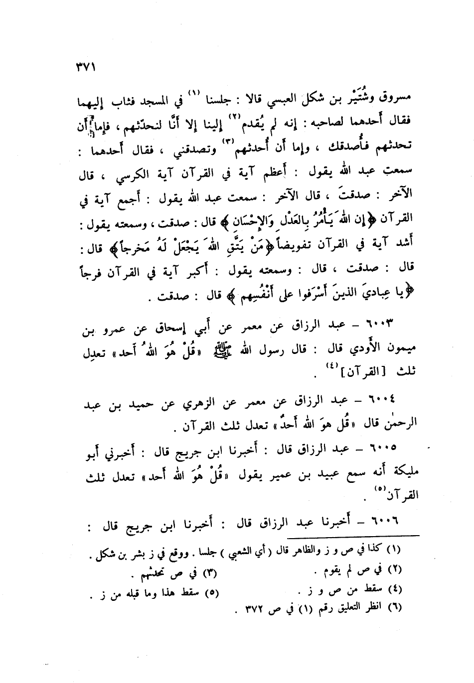 6003 - عَنْ مَعْمَرٍ، عَنْ أَبِي إِسْحَاقَ، عَنْ عَمْرِو بْنِ مَيْمُونٍ الْأَوْدِيِّ قَالَ: قَالَ رَسُولُ صَلَّى اللهُ عَلَيْهِ وَسَلَّمَ: «§قُلْ هُوَ اللَّهُ أَحَدٌ، تَعْدِلُ ثُلُثَ الْقُرْآنِ»