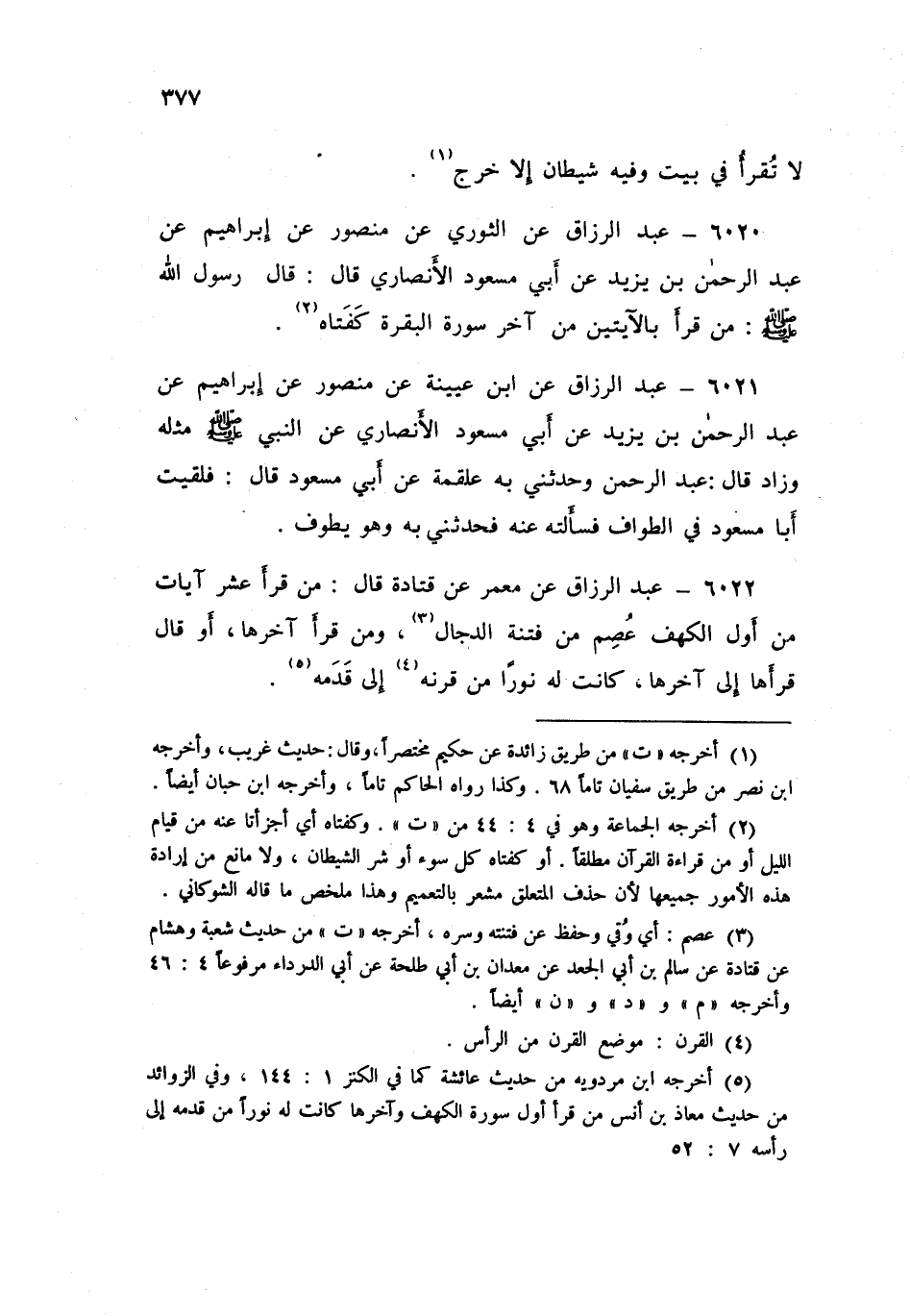 6022 - عَنْ مَعْمَرٍ، عَنْ قَتَادَةَ قَالَ: " §مَنْ قَرَأَ عَشْرَ آيَاتٍ مِنْ أَوَّلِ الْكَهْفِ عُصِمَ مِنْ فِتْنَةِ الدَّجَّالِ، وَمَنْ قَرَأَ آخِرَهَا - أَوْ قَالَ: قَرَأَهَا إِلَى آخِرِهَا - كَانَتْ لَهُ نُورًا مِنْ قَرْنِهِ إِلَى قَدَمِهِ "