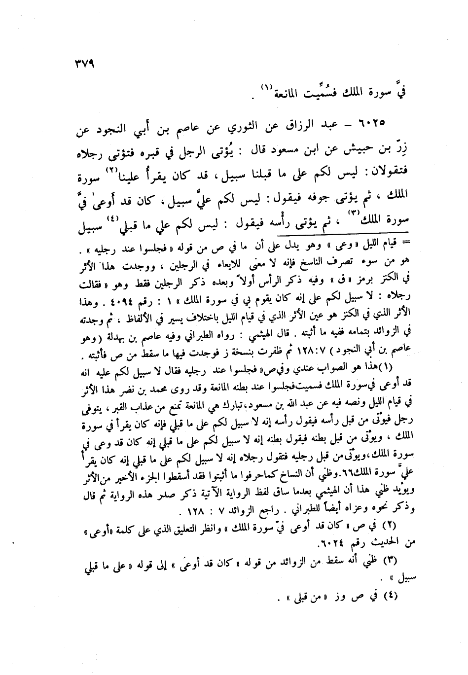 6026 - عَنْ مَعْمَرٍ، عَنْ أَبَانَ، عَنْ شَهْرِ بْنِ حَوْشَبٍ، عَنْ أَبِي الدَّرْدَاءِ قَالَ: «§مَنْ قَرَأَ فِي لَيْلَةٍ بِمِائَةِ آيَةٍ لَمْ تُحَاجِّهِ الْقُرْآنَ»