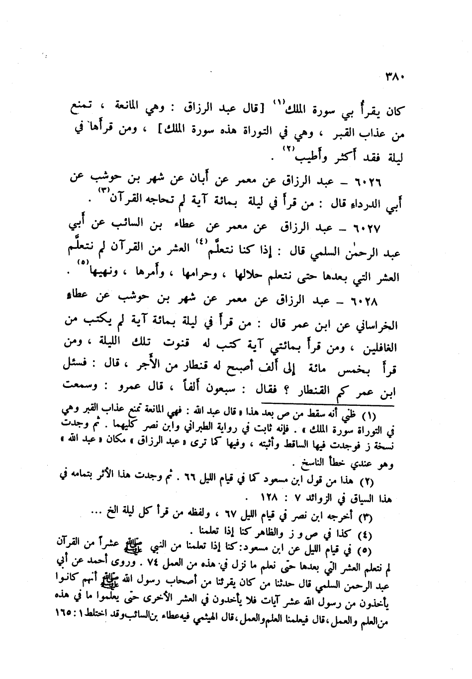 6027 - عَنْ مَعْمَرٍ، عَنْ عَطَاءِ بْنِ السَّائِبِ، عَنْ أَبِي عَبْدِ الرَّحْمَنِ السُّلَمِيِّ قَالَ: «إِذَا كُنَّا §نَتَعَلَّمُ الْعَشْرَ مِنَ الْقُرْآنِ لَمْ نَتَعَلَّمِ الْعَشْرَ الَّتِي بَعْدَهَا حَتَّى نَتَعَلَّمَ حَلَالَهَا وَحَرَامَهَا وَأَمْرَهَا وَنَهْيَهَا»
