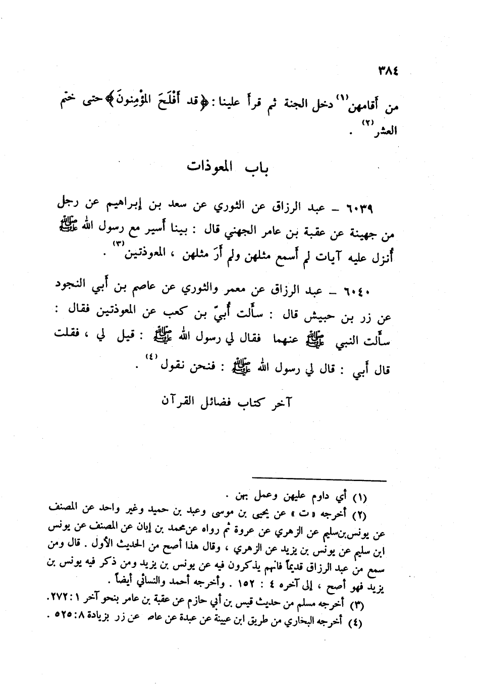 6039 - عَنِ الثَّوْرِيِّ، عَنْ سَعْدِ بْنِ إِبْرَاهِيمَ، عَنْ رَجُلٍ، مِنْ جُهَيْنَةَ، عَنْ عُقْبَةَ بْنِ عَامِرٍ الْجُهَنِيِّ قَالَ: «بَيْنَا أَسِيرُ مَعَ رَسُولِ اللَّهِ صَلَّى اللهُ عَلَيْهِ وَسَلَّمَ §أُنْزِلَ عَلَيْهِ آيَاتٌ لَمْ أَسْمَعْ مِثْلَهُنَّ وَلَمْ أَرَ مِثْلَهُنَّ الْمُعَوِّذَتَيْنِ»