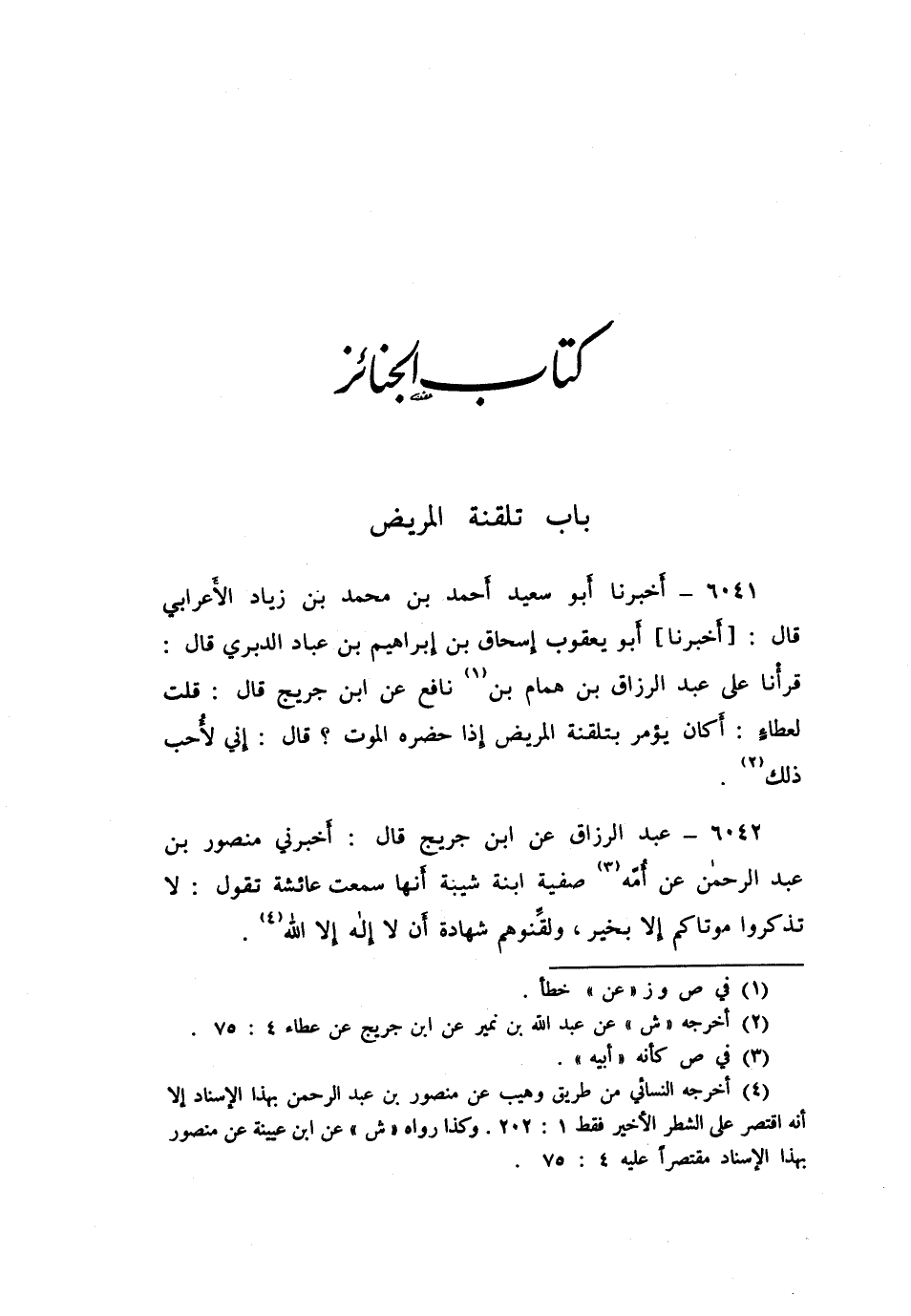 6041 - أَخْبَرَنَا أَبُو سَعِيدٍ أَحْمَدُ بْنُ مُحَمَّدِ بْنِ زِيَادٍ اْلَأَعْرَابِيُّ قَالَ: أَخْبَرَنَا أَبُو يَعْقُوبَ إِسْحَاقُ بْنُ إِبْرَاهِيمَ بْنِ عَبَّادٍ الدَّبَرِيُّ، قَالَ: قَرَأْنَا عَلَى عَبْدِ الرَّزَّاقِ بْنِ هَمَّامِ بْنِ نَافِعٍ، عَنِ ابْنِ جُرَيْجٍ قَالَ: قُلْتُ لِعَطَاءٍ: §أَكَانَ يُؤْمَرُ بِتَلْقِنَةِ الْمَرِيضِ إِذَا حَضَرَهُ الْمَوْتُ؟ قَالَ: «إِنِّي لَأُحِبُّ ذَلِكَ»