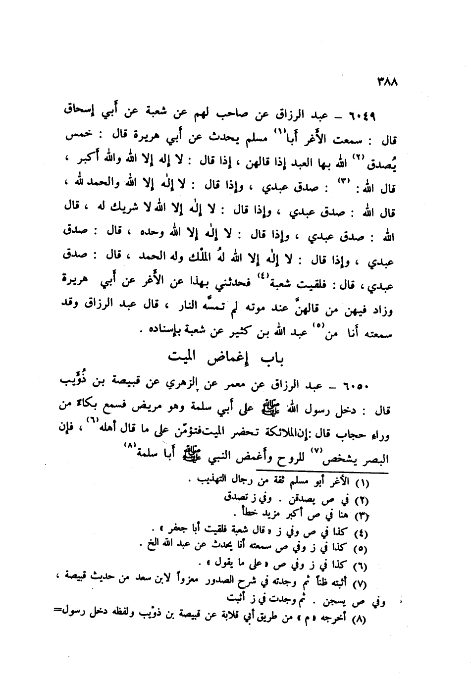 6050 - عَنْ مَعْمَرٍ، عَنِ الزُّهْرِيِّ، عَنْ قَبِيصَةَ بْنِ ذُؤَيْبٍ قَالَ: دَخَلَ رَسُولُ اللَّهِ صَلَّى اللهُ عَلَيْهِ وَسَلَّمَ عَلَى أَبِي سَلَمَةَ وَهُوَ مَرِيضٌ فَسَمِعَ بُكَاءً مِنْ وَرَاءِ حِجَابٍ قَالَ: «إِنَّ §الْمَلَائِكَةَ تَحْضُرُ الْمَيِّتَ فَتُؤَمِّنَ عَلَى مَا قَالَ أَهْلُهُ، فَإِنَّ الْبَصَرَ يَشْخَصُ لِلرُّوحِ» وَأَغْمَضَ النَّبِيُّ صَلَّى اللهُ عَلَيْهِ وَسَلَّمَ أَبَا سَلَمَةَ