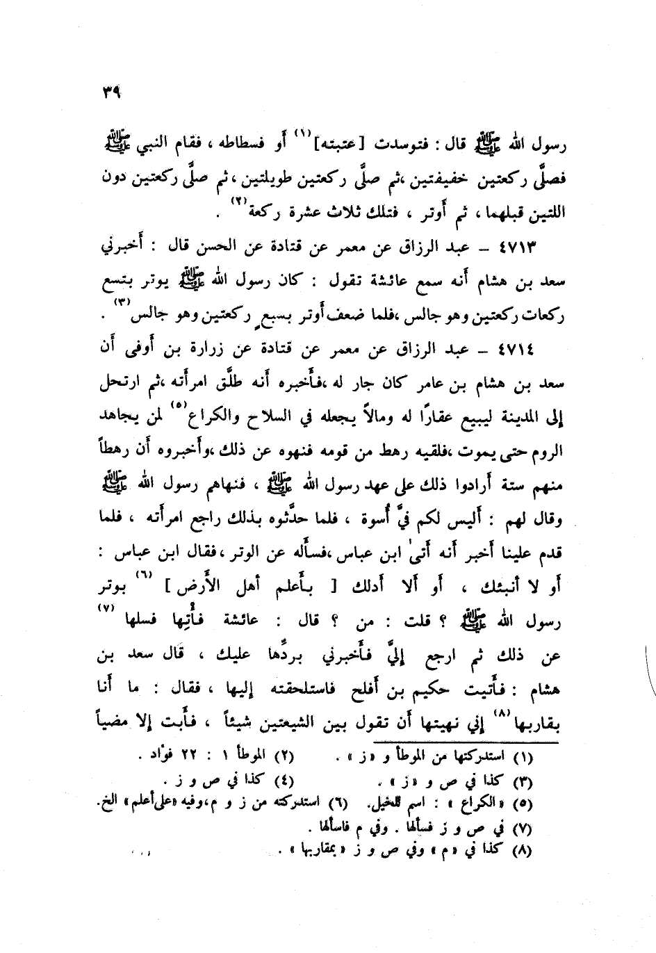 4714 - عَنْ مَعْمَرٍ، عَنْ قَتَادَةَ، عَنْ زُرَارَةَ بْنِ أَوْفَى: أَنَّ سَعْدَ بْنَ هِشَامِ بْنِ عَامِرٍ، كَانَ جَارًا لَهُ فَأَخْبَرَهُ أَنَّهُ طَلَّقَ امْرَأَتَهُ، ثُمَّ ارْتَحَلَ إِلَى الْمَدِينَةِ لِيَبِيعَ عَقَارًا لَهُ وَمَا لًا يَجْعَلَهُ فِي السِّلَاحِ وَالْكُرَاعِ لِمَنْ يُجَاهِدُ الرُّومَ حَتَّى يَمُوتَ، فَلَقِيَهُ رَهْطٌ مِنْ قَوْمِهِ فَنَهَوْهُ عَنْ ذَلِكَ، وَأَخْبَرُوهُ أَنَّ رَهْطًا مِنْهُمْ سِتَّةً أَرَادُوا ذَلِكَ عَلَى عَهْدِ رَسُولِ اللَّهِ صَلَّى اللهُ عَلَيْهِ وَسَلَّمَ فَنَهَاهُمْ رَسُولُ اللَّهِ صَلَّى اللهُ عَلَيْهِ وَسَلَّمَ، وَقَالَ لَهُمْ: «أَلَيْسَ لَكُمْ فِيَّ أُسْوَةٌ؟» فَلَمَّا حَدَّثُوهُ بِذَلِكَ رَاجَعَ امْرَأَتَهُ، فَلَمَّا قَدِمَ عَلَيْنَا أُخْبِرَ أَنَّهُ أَتَى ابْنَ عَبَّاسٍ فَسَأَلَهُ عَنِ الْوِتْرِ، فَقَالَ ابْنُ عَبَّاسٍ: أَوَلَا أُنْبِئُكَ، أَوَ أَلَا أَدُلُّكَ بِأَعْلَمِ أَهْلِ الْأَرْضِ بِوِتْرِ رَسُولِ اللَّهِ صَلَّى اللهُ عَلَيْهِ وَسَلَّمَ؟ قُلْتُ: مَنْ؟ قَالَ: عَائِشَةُ، فَأْتِهَا فَسَلْهَا عَنْ ذَلِكَ، ثُمَّ ارْجَعْ إِلَيَّ فَأَخْبِرْنِي بِرَدِّهَا عَلَيْكَ، قَالَ سَعْدُ بْنُ هِشَامٍ: فَأَتَيْتُ حَكِيمَ بْنَ أَفْلَحَ فَاسْتَلْحَقْتُهُ إِلَيْهَا، فَقَالَ: مَا أَنَا بِقَارِبِهَا، إِنِّي نَهَيْتُهَا أَنْ تَقُولَ بَيْنَ الشِّيعَتَيْنِ شَيْئًا فَأَبَتْ إِلَّا مُضِيًّا -[40]- فِيهَا، فَأَقْسَمَتُ عَلَيْهِ فَجَاءَ مَعِي، فَسَلَّمْنَا عَلَيْهَا، فَدَخَلَ فَعَرَفَتْهُ، فَقَالَتْ: أَحَكِيمٌ؟ فَقَالَ: نَعَمْ، فَقَالَتْ: مَنْ هَذَا مَعَكَ؟ قَالَ: سَعْدُ بْنُ هِشَامٍ قَالَتْ: مَنْ هِشَامٌ؟ قَالَ: ابْنُ عَامِرٍ قَالَتْ: نِعْمَ الْمَرْءُ كَانَ عَامِرٌ، أُصِيبَ مَعَ رَسُولِ اللَّهِ صَلَّى اللهُ عَلَيْهِ وَسَلَّمَ يَوْمَ أُحُدٍ قَالَ: فَقُلْتُ: يَا أُمَّ الْمُؤْمِنِينَ، أَنْبِئِينِي عَنْ خُلُقِ رَسُولِ اللَّهِ صَلَّى اللهُ عَلَيْهِ وَسَلَّمَ، فَقَالَتْ: أَمَا تَقْرَأُ الْقُرْآنَ؟ قُلْتُ: بَلَى قَالَتْ: «§فَإِنَّ خُلُقَ رَسُولِ اللَّهِ صَلَّى اللهُ عَلَيْهِ وَسَلَّمَ كَانَ الْقُرْآنَ» قَالَ: فَهَمَمْتُ أَنْ أَقُومَ فَبَدَا لِي، فَقُلْتُ لَهَا: أَنْبِئِينِي عَنْ قِيَامِ رَسُولِ اللَّهِ صَلَّى اللهُ عَلَيْهِ وَسَلَّمَ فَقَالَتْ: أَمَا تَقْرَأُ هَذِهِ السُّورَةَ «يَا أَيُّهَا الْمُزَّمِّلُ»؟ قَالَ: قُلْتُ: بَلَى قَالَتْ: فَإِنَّ اللَّهَ افْتَرَضَ الْقِيَامَ فِي أَوَّلِ هَذِهِ السُّورَةِ، فَقَامَ نَبِيُّ اللَّهِ صَلَّى اللهُ عَلَيْهِ وَسَلَّمَ وَأَصْحَابُهُ حَوْلَا حَتَّى انْتَفَخَتْ أَقْدَامُهُمْ، وَأَمْسَكَ اللَّهُ خَاتِمَتَهَا اثْنَيْ عَشَرَ شَهْرًا، ثُمَّ أَنْزَلَ اللَّهُ التَّخْفِيفَ فِي آخِرِ السُّورَةِ، فَصَارَ قِيَامُ اللَّيْلِ تَطَوُّعًا بَعْدَ إِذْ كَانَ فَرِيضَةً، فَهَمَمْتُ أَنْ أَقُومَ فَبَدَا لِي فَسَأَلْتُهَا، فَقُلْتُ: يَا أُمَّ الْمُؤْمِنِينَ، أَنْبِئِينِي عَنْ وِتْرِ رَسُولِ اللَّهِ صَلَّى اللهُ عَلَيْهِ وَسَلَّمَ، فَقَالَتْ: كُنَّا نُعِدُّ لَهُ سِوَاكَهُ وَطَهُورَهُ مِنَ اللَّيْلِ، فَيَبْعَثُهُ اللَّهُ مَا شَاءَ أَنْ يَبْعَثَهُ، ثُمَّ يَتَسَوَّكُ وَيَتَوَضَّأُ ثُمَّ يُصَلِّي تِسْعَ رَكَعَاتٍ لَا يَقْعُدُ فِيهِنَّ إِلَّا عِنْدَ الثَّامِنَةِ، فَيَحْمَدُ اللَّهَ وَيَذْكُرُهُ وَيَدْعُوهُ، ثُمَّ يَنْهَضُ وَلَا يُسَلِّمُ حَتَّى يُصَلِّيَ التَّاسِعَةَ، فَيَقْعُدُ وَيَحْمَدُ اللَّهَ وَيَذْكُرُهُ وَيَدْعُوهُ، ثُمَّ يُسَلِّمُ تَسْلِيمًا يُسْمِعُنَا، ثُمَّ يُصَلِّي رَكْعَتَيْنِ وَهُوَ قَاعِدٌ -[41]- بَعْدَمَا يُسَلِّمُ، فَتِلْكَ إِحْدَى عَشْرَةَ رَكْعَةً أَيْ بُنَيَّ فَلَمَّا أَسَنَّ رَسُولُ اللَّهِ صَلَّى اللهُ عَلَيْه