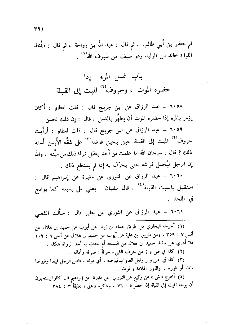 6059 - عَنِ ابْنِ جُرَيْجٍ قَالَ: قُلْتُ لِعَطَاءٍ: أَرَأَيْتَ حُرُوفَ الْمَيِّتِ إِلَى الْقِبْلَةِ حِينَ يَحِينُ فَوْضُهُ عَلَى شِقِّهِ الْأَيْمَنِ، أَسُنَّةٌ ذَلِكَ؟ قَالَ: «§سُبْحَانَ اللَّهِ مَا عَلِمْتُ مِنْ أَحَدٍ يَعْقِلُ تَرَكَ ذَلِكَ مِنْ مَيِّتِهِ، وَاللَّهِ إِنَّ الرَّجُلَ لَيُحْمَلُ فِرَاشُهُ حَتَّى يُحَرَّفَ بِهِ إِذَا لَمْ يَسْتَطِعْ ذَلِكَ»