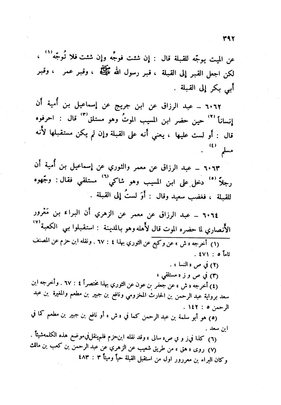 6063 - عَنْ مَعْمَرٍ، وَالثَّوْرِيِّ، عَنْ إِسْمَاعِيلَ بْنِ أُمَيَّةَ، أَنَّ رَجُلًا دَخَلَ عَلَى ابْنِ الْمُسَيِّبِ وَهُوَ شَاكٍ مُسْتَلْقٍ، فَقَالَ: وَجِّهُوهُ لِلْقِبْلَةِ، فَغَضِبَ سَعِيدٌ وَقَالَ: «§أَوَلَسْتُ إِلَى الْقِبْلَةِ؟»