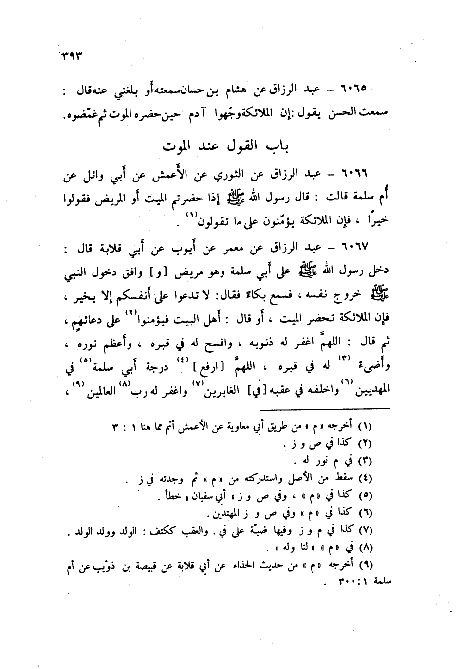 6066 - عَنِ الثَّوْرِيِّ، عَنِ الْأَعْمَشِ، عَنْ أَبِي وَائِلٍ، عَنْ أُمِّ سَلَمَةَ قَالَتْ: قَالَ رَسُولُ اللَّهِ صَلَّى اللهُ عَلَيْهِ وَسَلَّمَ: «إِذَا §حَضَرْتُمُ الْمَيِّتَ أَوِ الْمَرِيضَ فَقُولُوا خَيْرًا؛ فَإِنَّ الْمَلَائِكَةَ يُؤَمِّنُونَ عَلَى مَا تَقُولُونَ»