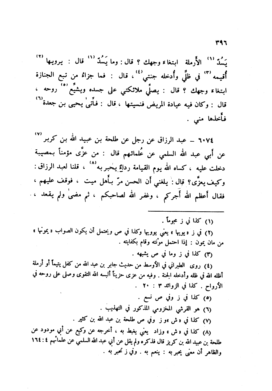 6074 - عَنْ رَجُلٍ، عَنْ طَلْحَةَ بْنِ عُبَيْدِ اللَّهِ بْنِ كَرِيزٍ، عَنْ أَبِي عَبْدِ اللَّهِ السُّلَمِيِّ، عَنْ عُلَمَائِهِمْ قَالَ: «§مَنْ عَزَّى مُؤْمِنًا بِمُصِيبَةٍ دَخَلَتْ عَلَيْهِ كَسَاهُ اللَّهُ يَوْمَ الْقِيَامَةِ رِدَاءً يُحَبَّرُ بِهِ»، قُلْنَا لِعَبْدِ الرَّزَّاقِ: وَكَيْفَ يُعَزَّى؟ قَالَ: بَلَغَنِي أَنَّ الْحَسَنَ مَرَّ بِأَهْلِ مَيِّتٍ فَوَقَفَ عَلَيْهِمْ فَقَالَ: أَعْظَمَ اللَّهُ أَجْرَكُمْ وَغَفَرَ اللَّهُ لِصَاحِبِكُمْ، ثُمَّ مَضَى وَلَمْ يَقْعُدْ، قُلْنَا لَهُ: مَنْ يُعَزَّى؟ قَالَ: يُعَزَّى كُلُّ حَزِينٍ، فَقَدْ يَكُونُ الرَّجُلُ حَزِينًا لِصَاحِبِهِ وَأَخِيهِ أشَدَّ مِنْ حُزْنِ أَهْلِهِ عَلَيْهِ