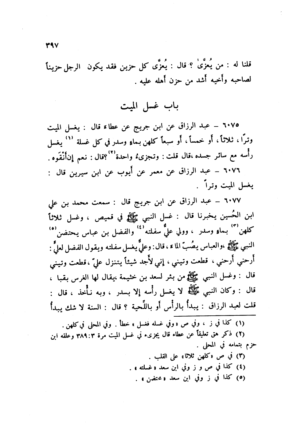 6077 - عَنِ ابْنِ جُرَيْجٍ قَالَ: سَمِعْتُ مُحَمَّدَ بْنَ عَلِيِّ بْنِ الْحُسَيْنِ يُخْبِرُنَا قَالَ: «§غُسِّلَ النَّبِيُّ صَلَّى اللهُ عَلَيْهِ وَسَلَّمَ فِي قَمِيصٍ، وَغُسِّلَ ثَلَاثًا كُلُّهُنَّ بِمَاءٍ وَسِدْرٍ، وَوَلِيَ عَلِيٌّ سَفْلَتَهُ، وَالْفَضْلُ بْنُ عَبَّاسٍ يَحْتَضِنُ النَّبِيَّ صَلَّى اللهُ عَلَيْهِ وَسَلَّمَ، وَالْعَبَّاسُ يَصُبُّ الْمَاءَ» قَالَ: وَعَلِيٌّ يَغْسِلُ سَفْلَتَهُ وَيَقُولُ: الْفَضْلُ لِعَلِيٍّ: أَرِحْنِي أَرِحْنِي، قَطَعْتَ وَتِينِي، إِنِّي لَأَجِدُ شَيْئًا يَتَنَزَّلُ عَلَيَّ، قَطَعْتَ وَتِينِي قَالَ: " وَغُسِّلَ النَّبِيُّ صَلَّى اللهُ عَلَيْهِ وَسَلَّمَ مِنْ بِئْرٍ لِسَعْدِ بْنِ خُثَيْمَةَ يُقَالُ لَهَا: الْغَرْسُ بِقِبَا قَالَ: وَكَانَ النَّبِيُّ صَلَّى اللهُ عَلَيْهِ وَسَلَّمَ لَا يَغْسِلُ رَأْسَهُ إِلَّا بِسِدْرٍ، وَبِهِ نَأْخُذُ. قَالَ: قُلْتُ لِعَبْدِ الرَّزَّاقِ: يُبْدَأُ بِالرَّأْسِ أَوْ بِاللِّحْيَةِ؟ قَالَ: السُّنَّةُ لَا شَكَّ يُبْدَأُ -[398]- بِالرَّأْسِ ثُمَّ اللِّحْيَةِ