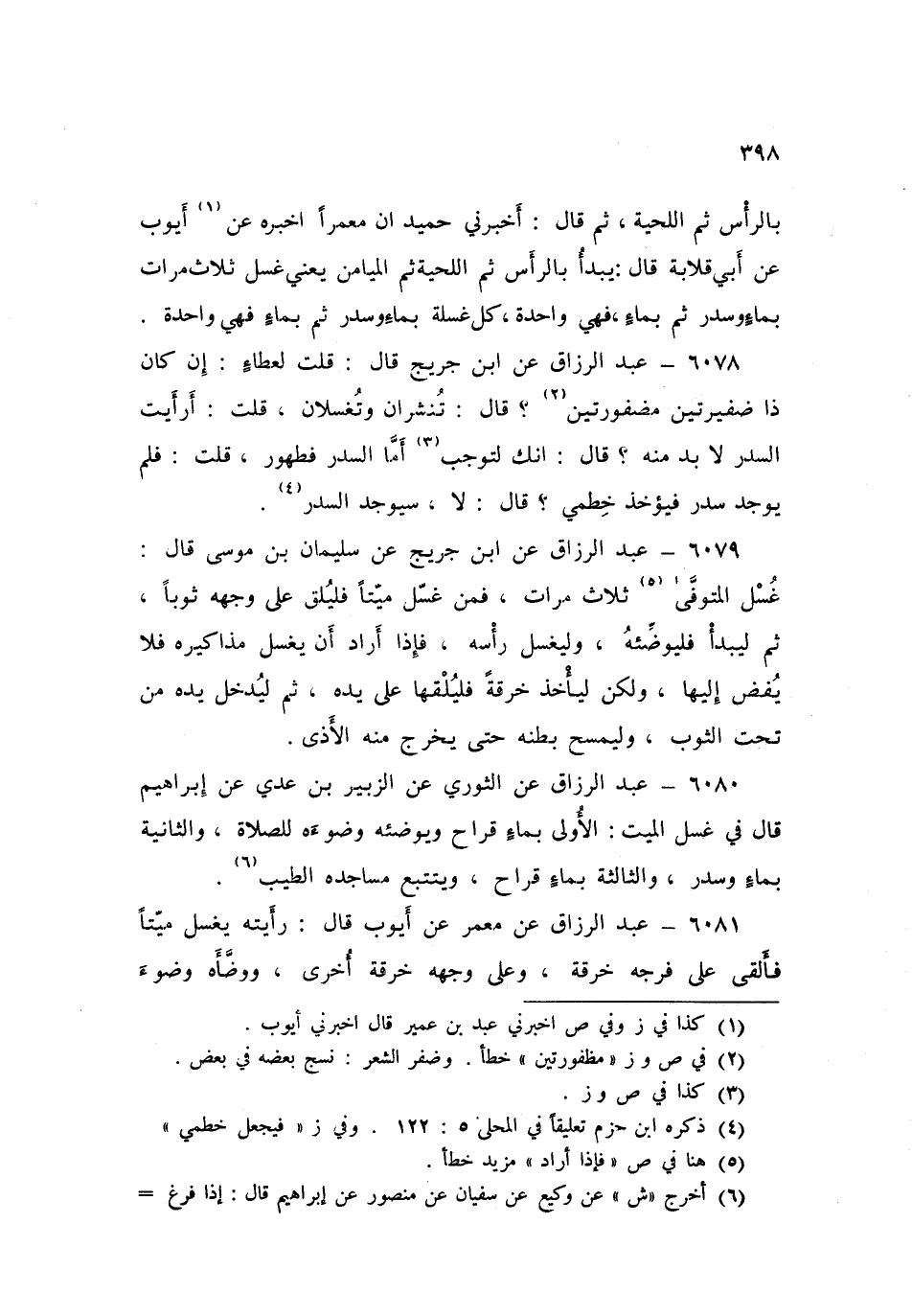 6081 - عَنْ مَعْمَرٍ، عَنْ أَيُّوبَ قَالَ: «§رَأَيْتُهُ يُغَسِّلُ مَيِّتًا فَأَلْقَى عَلَى فَرْجِهِ خِرْقَةً وَعَلَى وَجْهِهِ خِرْقَةً أُخْرَى، وَوَضَّأَهُ وُضُوءَ الصَّلَاةِ، ثُمَّ بَدَأَ بِمَيَامِنِهِ»، قَالَ عَبْدُ الرَّزَّاقِ، قَالَ مَعْمَرٌ: وَكَانَ قَتَادَةُ يَقُولُ: يَبْدَأُ بِمَيَامِنِهِ قَالَ: «فَإِذَا أَرَادَ أَنْ يُؤَضِّئَهُ نَزَعَ الَّتِي عَلَى وَجْهِهِ، فَأَمَّا الَّتِي عَلَى فَرْجِهِ فَلَا يُحَرِّكْهَا، وَلَكِنَّهُ يَضَعُ عَلَى يَدِهِ خِرْقَةً، ثُمَّ يُدْخِلُهَا تَحْتَ الْخِرْقَةِ»، قَالَ عَبْدُ الرَّزَّاقِ: قَالَ مَعْمَرٌ: قَالَ أَيُّوبُ: «وَإِذَا لَمْ يَجِدُوا سِدْرًا غَسَّلُوهُ بِالْأُشْنَانِ إِذَا طَالَ مَرَضُهُ وَكَثُرَ»