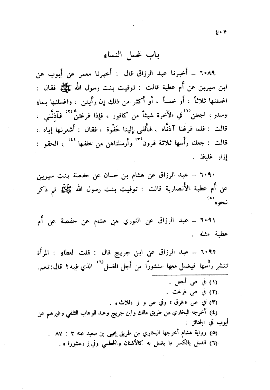 6090 - عَنْ هِشَامِ بْنِ حَسَّانَ، عَنْ حَفْصَةَ بِنْتِ سِيرِينَ، عَنْ أُمِّ عَطِيَّةَ الْأَنْصَارِيَّةَ قَالَتْ: تُوُفِّيَتْ بِنْتُ رَسُولِ اللَّهِ صَلَّى اللهُ عَلَيْهِ وَسَلَّمَ. ثُمَّ ذَكَرَ نَحْوَهُ، عَبْدُ الرَّزَّاقِ،