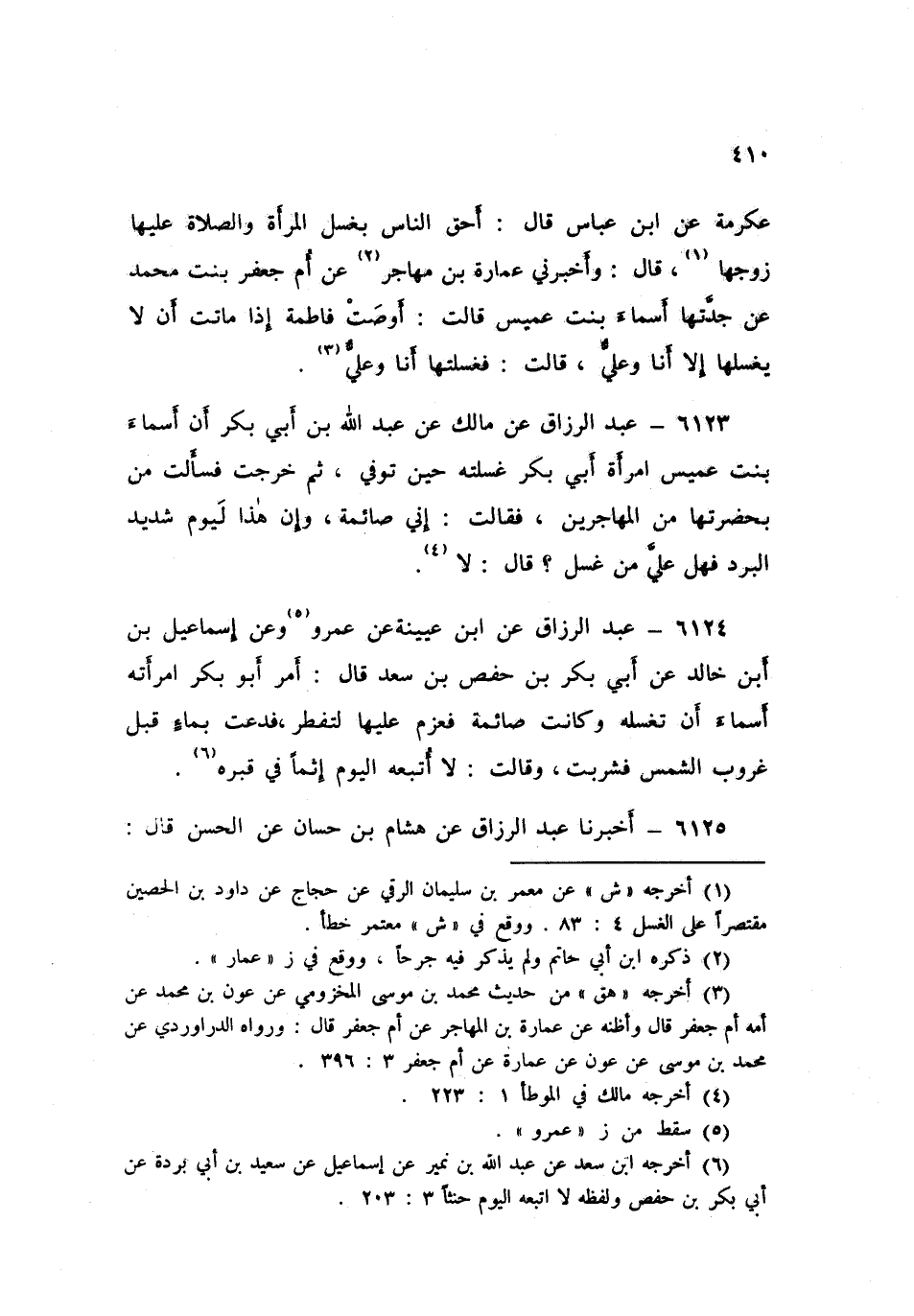 6126 - عَنْ مُحَمَّدِ بْنِ رَاشِدٍ قَالَ: أَخْبَرَنَا عَبْدُ اللَّهِ بْنُ مُحَمَّدِ بْنِ عَقِيلِ بْنِ أَبِي طَالِبٍ، أَنَّ فَاطِمَةَ لَمَّا حَضَرَتْهَا الْوَفَاةُ أَمَرَتْ عَلِيًّا فَوَضَعَ لَهَا غُسْلًا فَاغْتَسَلَتْ وَتَطَهَّرَتْ وَدَعَتْ ثِيَابَ أَكْفَانِهَا فَأُتِيَتْ بِثِيَابٍ غِلَاظٍ فَلَبِسَتْهَا وَمَسَّتْ مِنَ الْحَنُوطِ ثُمَّ أَمَرَتْ عَلِيًّا أَنْ §لَا تُكْشَفَ إِذَا قَضَتْ، وَأَنْ تُدْرَجَ كَمَا هِيَ فِي ثِيَابِهَا " قَالَ: فَقُلْتُ لَهُ: «هَلْ عَلِمْتَ أَحَدًا فَعَلَ ذَلِكَ؟» قَالَ: نَعَمْ، كَثِيرُ بْنُ عَبَّاسٍ، وَكَتَبَ فِي أَطْرَافِ أَكْفَانِهِ: شَهِدَ كَثِيرُ بْنُ عَبَّاسٍ أَنْ لَا إِلَهَ إِلَّا اللَّهُ