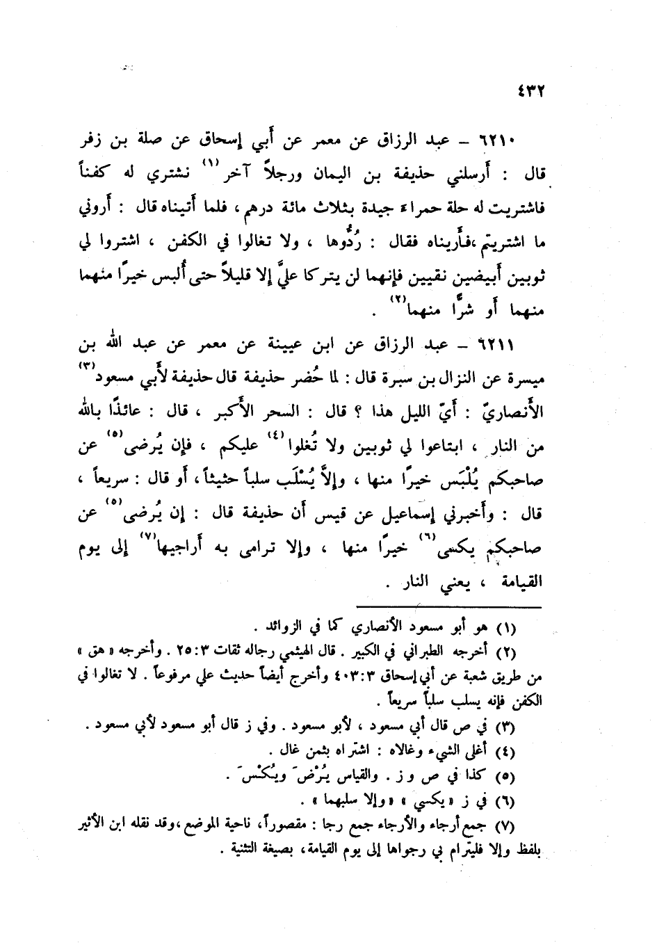 6211 - عَنِ ابْنِ عُيَيْنَةَ، عَنْ مَعْمَرٍ، عَنْ عَبْدِ اللَّهِ بْنِ مَيْسَرَةَ، عَنِ النَّزَّالِ بْنِ سَبْرَةَ قَالَ: لَمَّا حُضِرَ حُذَيْفَةُ، قَالَ حُذَيْفَةُ لِأَبِي مَسْعُودٍ الْأَنْصَارِيِّ: «§أَيُّ اللَّيْلِ هَذَا؟» قَالَ: السَّحَرُ الْأَكْبَرُ قَالَ: " عَائِذَا بِاللَّهِ مِنَ النَّارِ ابْتَاعُوا لِي ثَوْبَيْنِ وَلَا تُغْلُوا عَلَيْكُمْ، فَإِنْ يُرْضَ عَنْ صَاحِبِكُمْ يُلْبَسْ خَيْرًا مِنْهَا، وَإِلَّا يُسْلَبْ سَلْبَا حَثِيثَا، أَوْ قَالَ: سَرِيعًا "