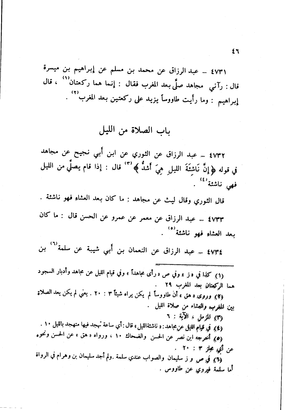 4732 - عَنِ الثَّوْرِيِّ، عَنِ ابْنِ أَبِي نَجِيحٍ، عَنْ مُجَاهِدٍ فِي قَوْلِهِ: {§إِنَّ نَاشِئَةَ اللَّيْلِ هِيَ أَشَدُّ} [المزمل: 6] قَالَ: «إِذَا قَامَ يُصَلِّي مِنَ اللَّيْلِ فَهِيَ نَاشِئَةٌ»