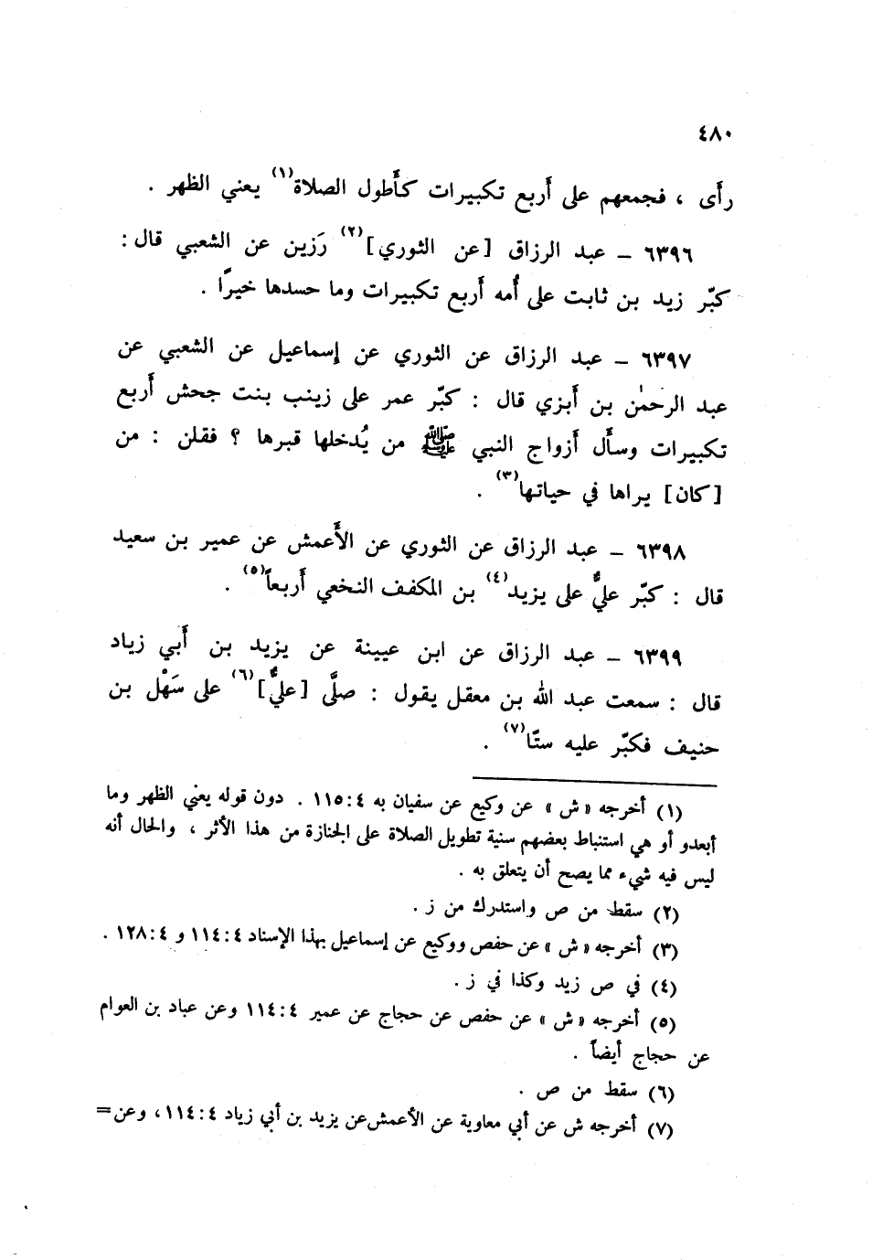 6398 - عَنِ الثَّوْرِيِّ، عَنِ الْأَعْمَشِ، عَنْ عُمَيْرِ بْنِ سَعِيدٍ قَالَ: «§كَبَّرَ عَلِيٌّ عَلَى يَزِيدَ بْنِ الْمُكَفَّفِ النَّخَعِيِّ أَرْبَعًا»