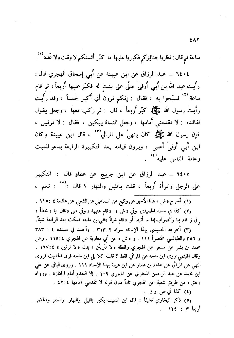 6405 - عَنِ ابْنِ جُرَيْجٍ، عَنْ عَطَاءٍ قَالَ: §التَّكْبِيرُ عَلَى الرَّجُلِ وَالْمَرْأَةِ أَرْبَعًا، قُلْتُ: بِاللَّيْلِ وَالنَّهَارِ؟ قَالَ: نَعَمْ، قُلْتُ: «فَوَضَعُوا رَجُلَيْنِ جَمِيعًا، قَالَ يُكَبَّرُ عَلَيْهِمَا أَرْبَعَ تَكْبِيرَاتٍ»، فَقَالَ السَّائِلُ: فَإِنَّ أُنَاسًا يَقُولُونَ: ثَلَاثٌ كَمَا الْمَغْرِبُ ثَلَاثٌ قَالَ: مَا سَمِعْنَا بِذَلِكَ