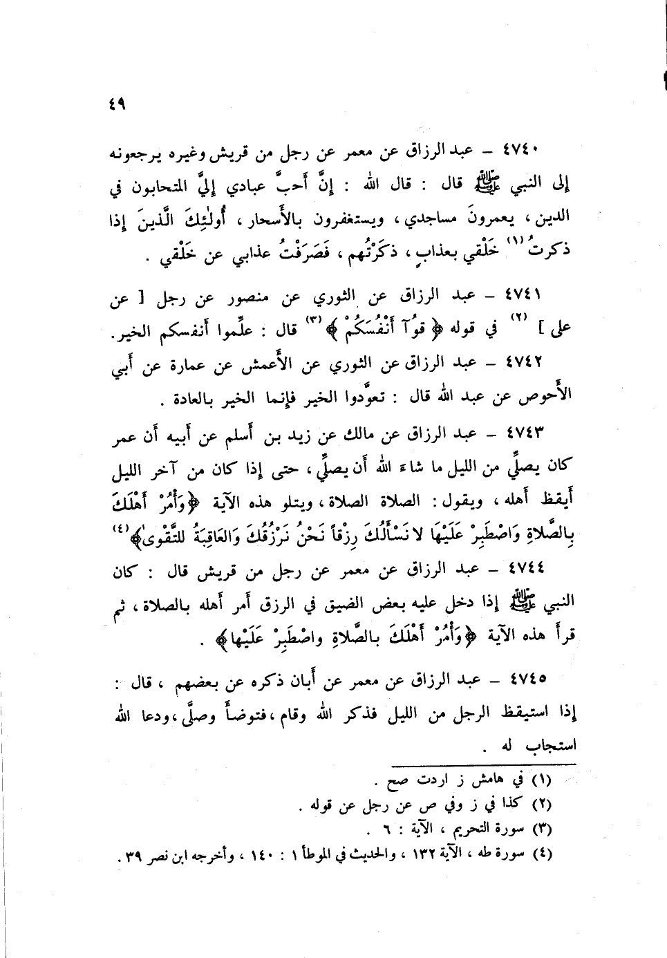 4743 - عَنْ مَالِكٍ، عَنْ زَيْدِ بْنِ أَسْلَمَ، عَنْ أَبِيهِ، أَنَّ عُمَرَ كَانَ §يُصَلِّي مِنَ اللَّيْلِ مَا شَاءَ اللَّهُ أَنْ يُصَلِّيَ، حَتَّى إِذَا كَانَ مِنْ آخِرِ اللَّيْلِ أَيْقَظَ أَهْلَهُ، وَيَقُولُ: الصَّلَاةَ الصَّلَاةَ، وَيَتْلُو هَذِهِ الْآيَةَ: {وَأْمُرْ أَهْلَكَ بِالصَّلَاةِ وَاصْطَبِرْ عَلَيْهَا لَا نَسْأَلُكَ رِزْقًا نَحْنُ نَرْزُقُكَ وَالْعَاقِبَةُ لِلتَّقْوَى} [طه: 132]