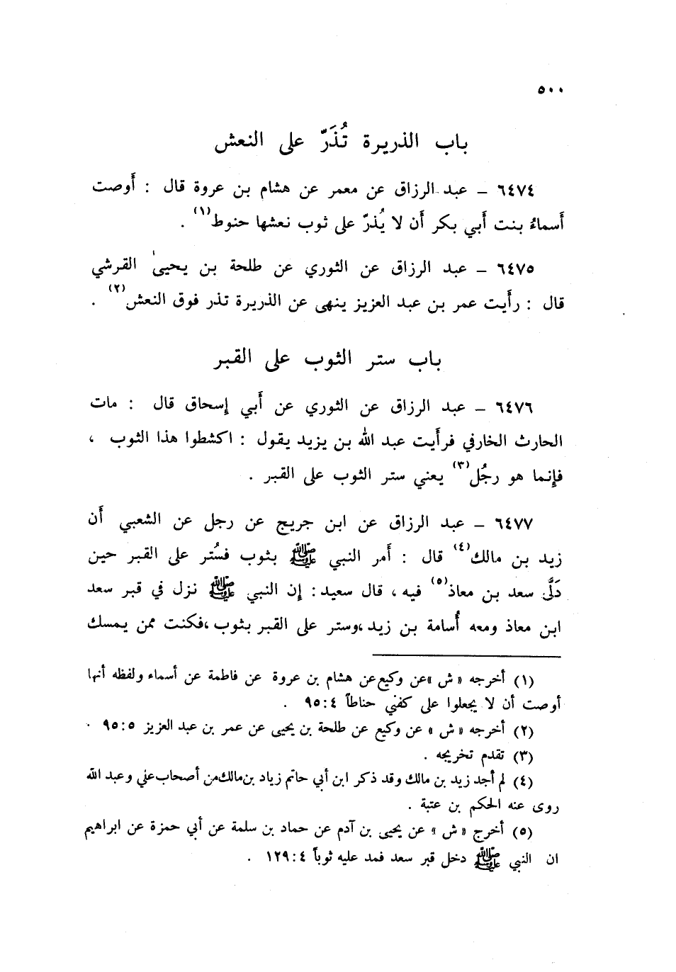 6474 - عَنْ مَعْمَرٍ، عَنْ هِشَامِ بْنِ عُرْوَةَ قَالَ: أَوْصَتْ أَسْمَاءُ بِنْتُ أَبِي بَكْرٍ «أَنْ §لَا يُذَرَّ عَلَى ثَوْبِ نَعْشِهَا حَنُوطٌ»