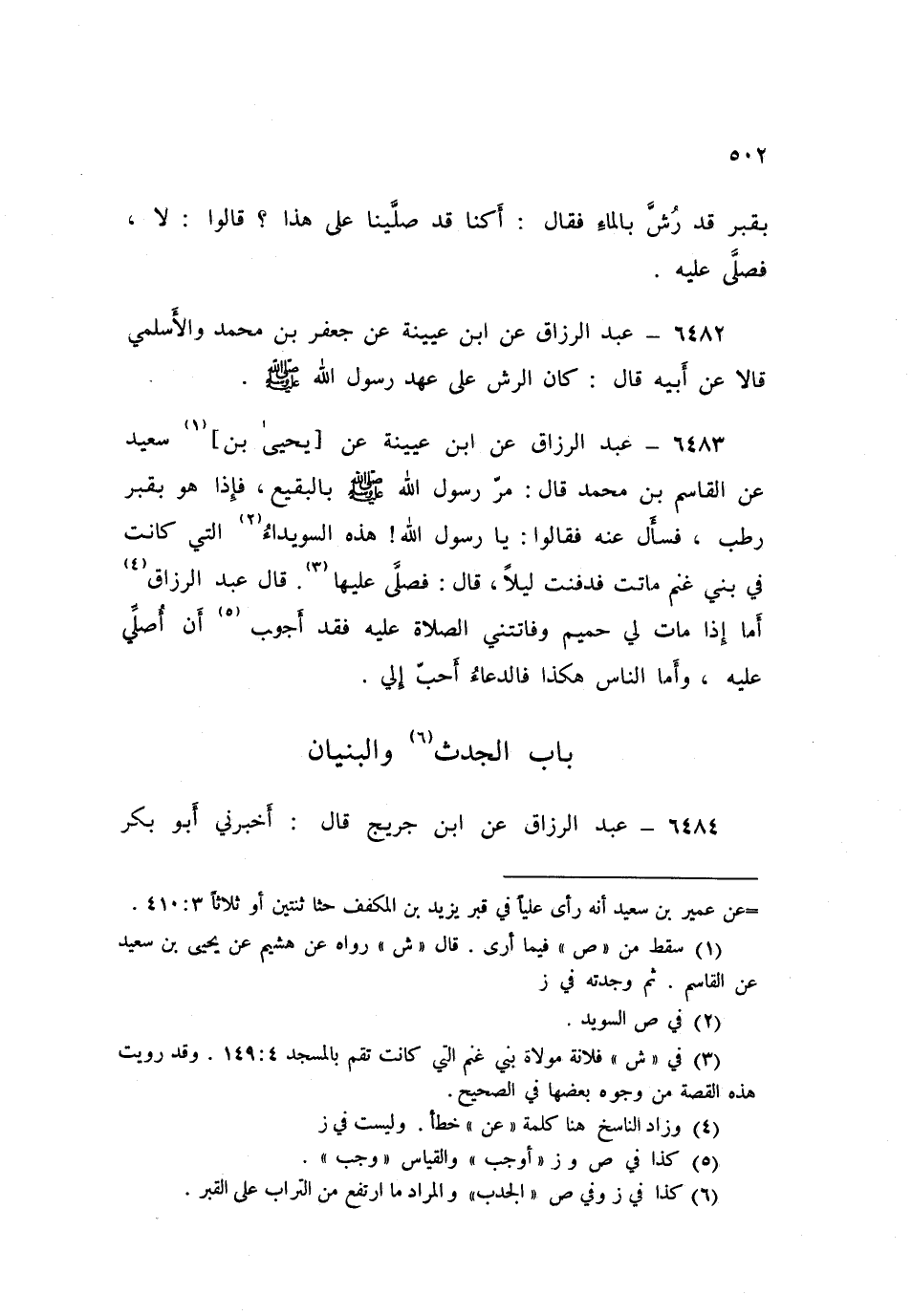 6483 - عَنِ ابْنِ عُيَيْنَةَ، عَنْ يَحْيَى بْنِ سَعِيدٍ، عَنِ الْقَاسِمِ بْنِ مُحَمَّدٍ قَالَ: «§مَرَّ رَسُولُ اللَّهِ صَلَّى اللهُ عَلَيْهِ وَسَلَّمَ بِالْبَقِيعِ، فَإِذَا هُوَ بِقَبْرٍ رَطْبٍ»، فَسَأَلَ عَنْهُ فَقَالُوا: يَا رَسُولَ اللَّهِ، هَذِهِ السُّوَيْدَاءُ الَّتِي كَانَتْ فِي بَنِي غَنْمٍ مَاتَتْ فَدُفِنَتْ لَيْلًا قَالَ: «فَصَلَّى عَلَيْهَا»، قَالَ عَبْدُ الرَّزَّاقِ: أَمَا إِذَا مَاتَ لِي حَمِيمٌ وَفَاتَتْنِي الصَّلَاةُ عَلَيْهِ فَقَدْ أَوْجَبَ أَنْ أُصَلِّيَ عَلَيْهِ، وَأَمَّا النَّاسُ هَكَذَا، فَالدُّعَاءُ أَحَبُّ إِلَيَّ