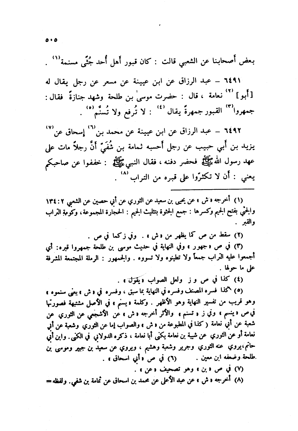 6493 - عَنْ مَعْمَرٍ، عَنْ عَبْدِ اللَّهِ بْنِ طَاوُسٍ، عَنْ أبيه، كَانَ يَكْرَهُ أَنْ يُبْنَى عَلَى الْقَبْرِ أَوْ يُجَصَّصَ أَوْ يُتَغَوَّطَ عِنْدَهُ، وَكَانَ يَقُولُ: «§لَا تَتَّخِذُوا قُبُورَ إِخْوَانِكُمْ حِشَانًا»