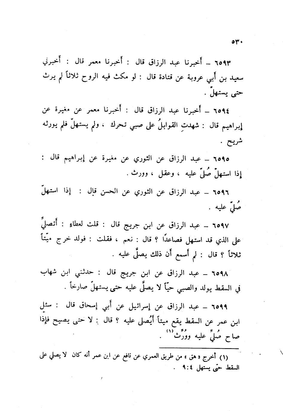 6594 - عَبْدُ الرَّزَّاقِ قَالَ: أَخْبَرَنَا مَعْمَرٌ، عَنْ مُغِيرَةَ، عَنْ إِبْرَاهِيمَ قَالَ: «§شَهِدْتُ الْقَوَابِلَ عَلَى صَبِيٍّ تَحَرَّكَ وَلَمْ يَسْتَهِلَّ فَلَمْ يُوَرِّثُهُ شُرَيْحٌ»